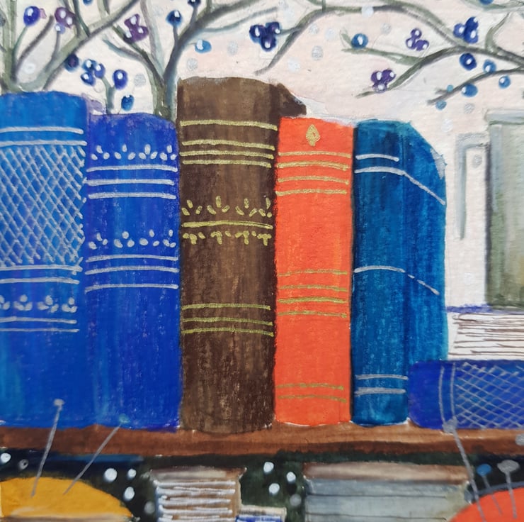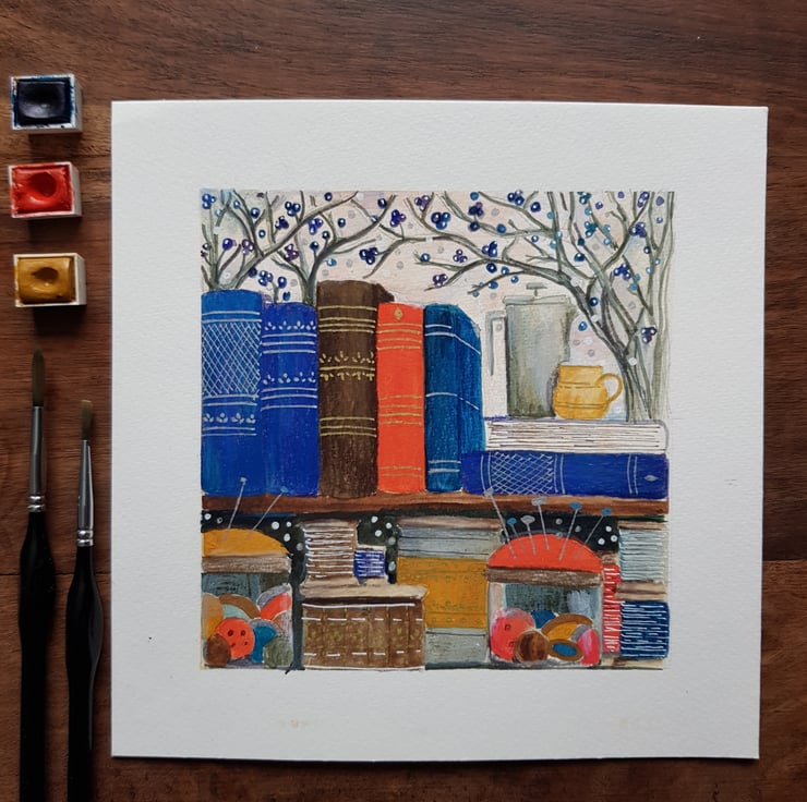 This painting will make a great gift for anyone who likes reading, walking or crafting. It is sold with mount and framed in a 23cm by 23cm frame that can be hung or use as bookcase or tabletop decoration.