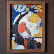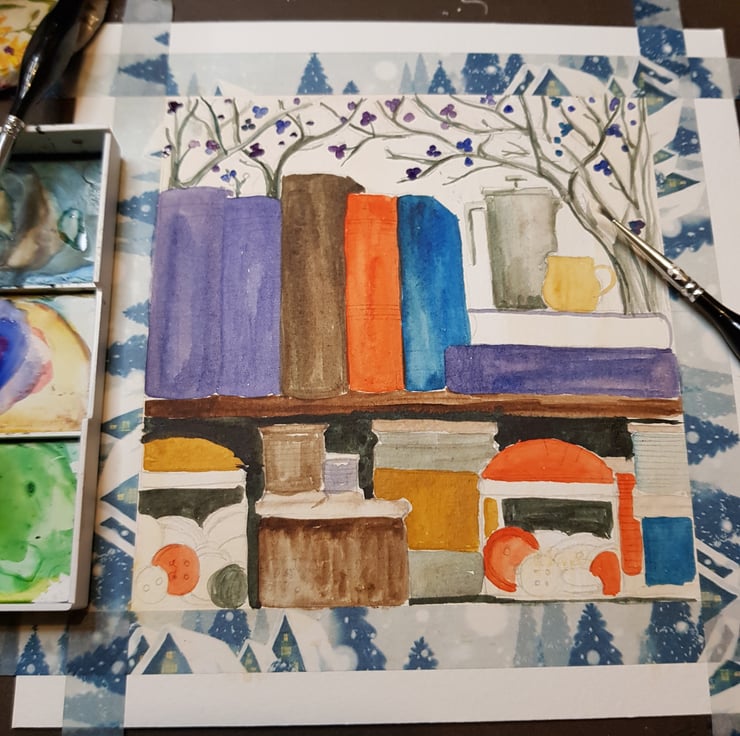 15cm by 15cm original art created using watercolours, acrylic paint and coloured pencils.