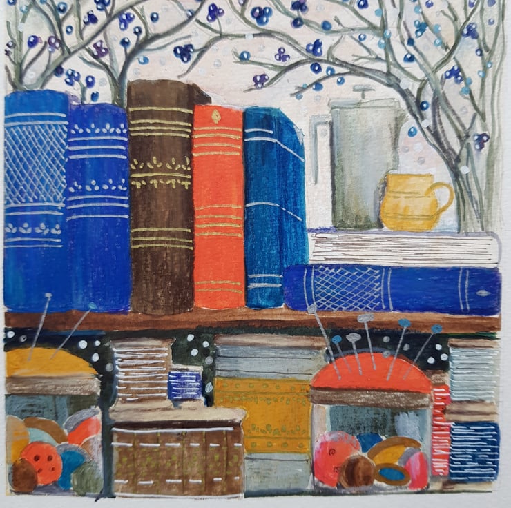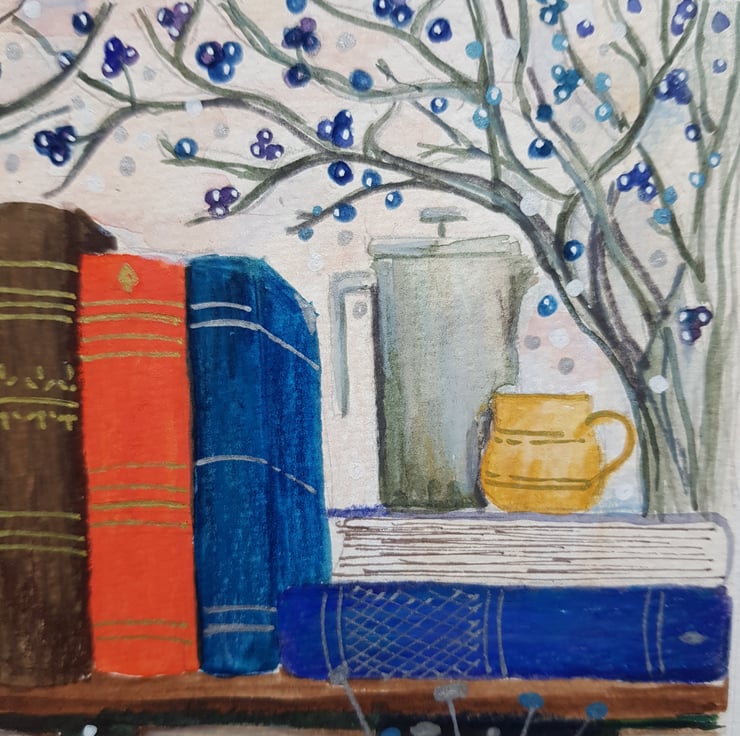 The blackthorn growing in the hedgerow was the inspiration for this artwork. The different berries that adorn the shrubs in winter remind me of small vintage buttons and, of course, it is really cosy to curl up with a good book after a walk in the cold weather.
