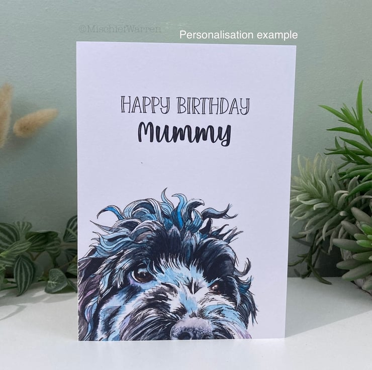 This black cockapoo dog card can be personalised or blank and features a print of my hand drawn, ink and watercolour painting. I can add any text you like for any occasion: birthday, Valentine’s Day, Mother’s Day, Father’s Day, Thank you, Wedding, Anniversary or Christmas perhaps I particularly like the sentiment "Did someone say cake?" which covers any celebration involving cake! Handmade entirely by me, here in Devon.