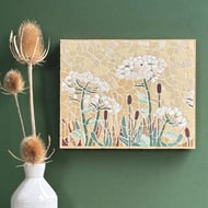 I use beautiful Winckelmans tiles which are matt ceramic and come in soft muted tones. I hand cut each piece of tessera to create intricate images inspired by nature. The mosaic is mounted on a wooden canvas and the sides are part tiled to frame the plaque and give depth and is complete with hanging wire.