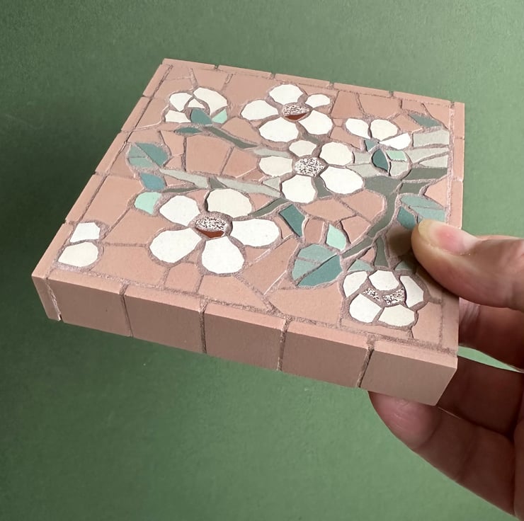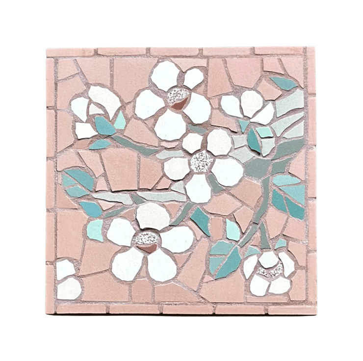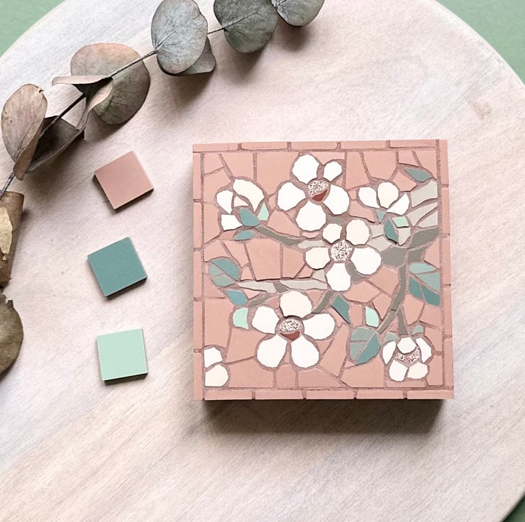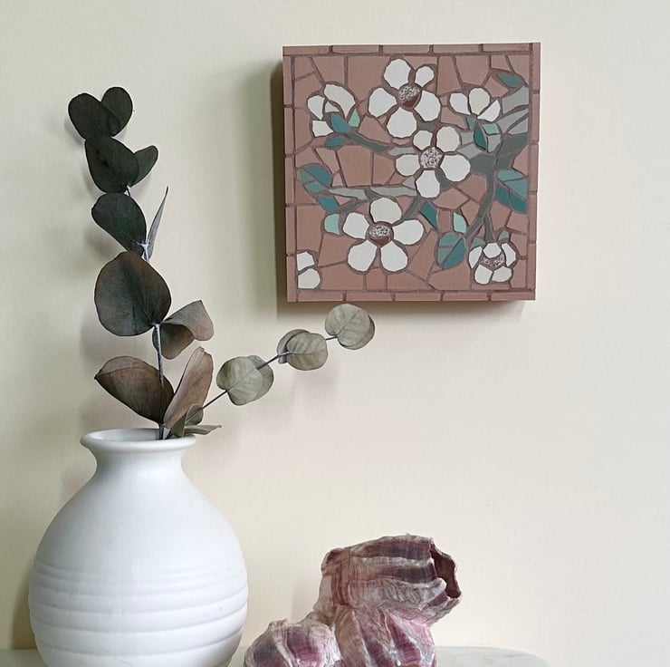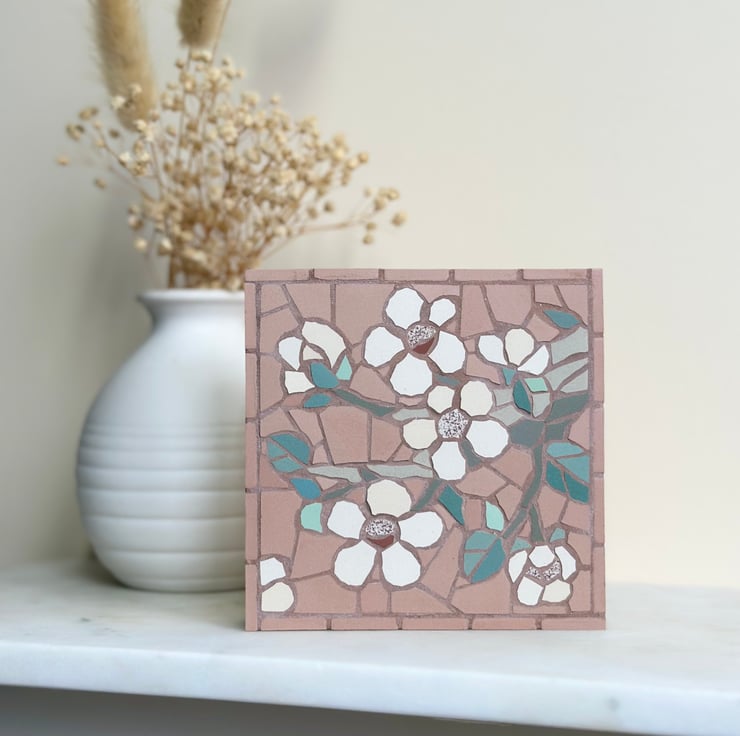 This original and mini floral art is created in mosaic and features a blossom branch with delicate white flowers on a dusky pink background.