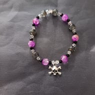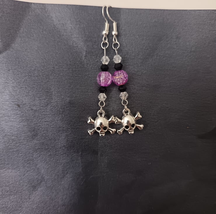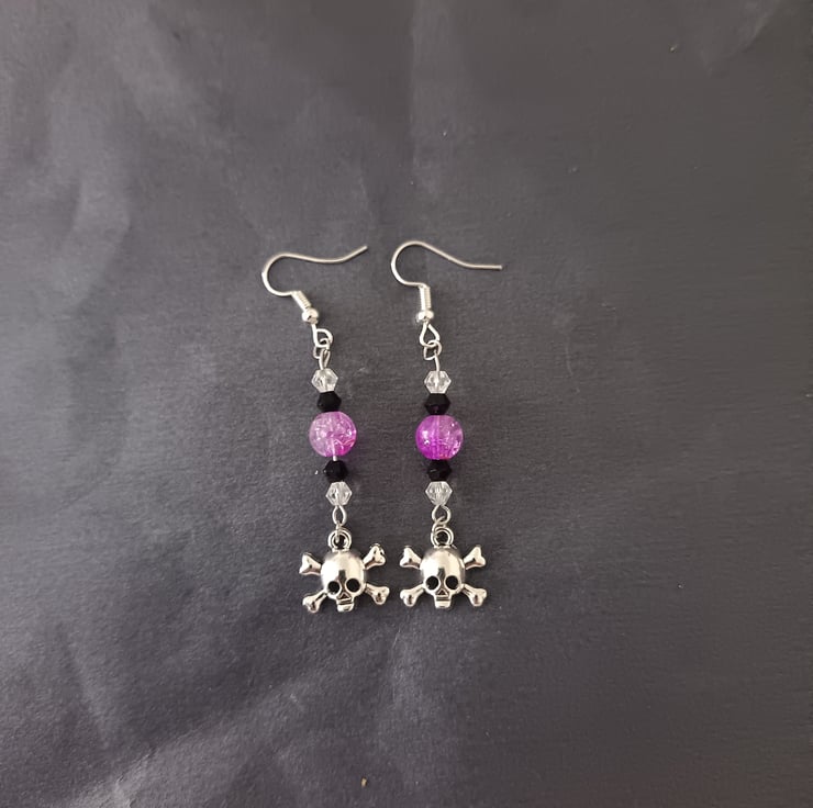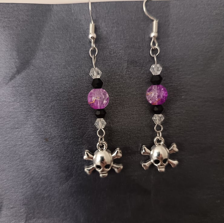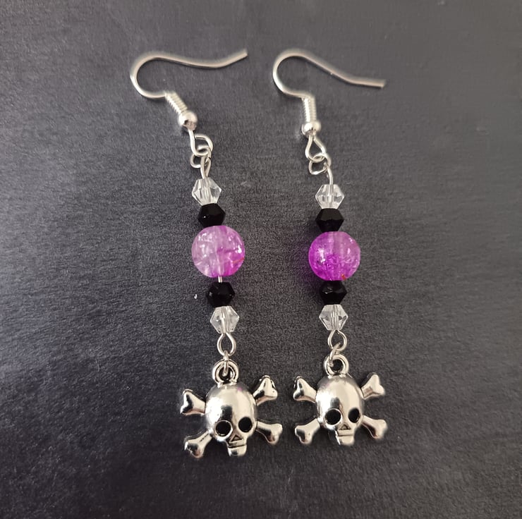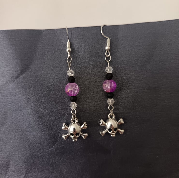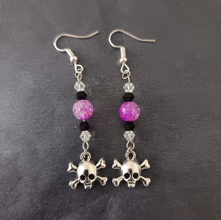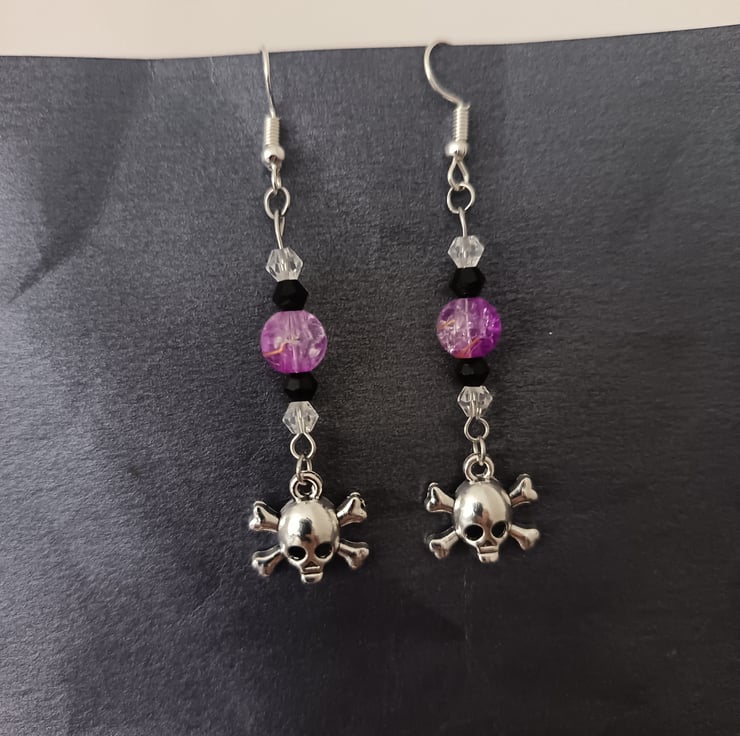 These handmade earrings are crafted with glass beads in lilac, clear AB and black, stainless steel hooks and stainless steel skull and crossbones charms.