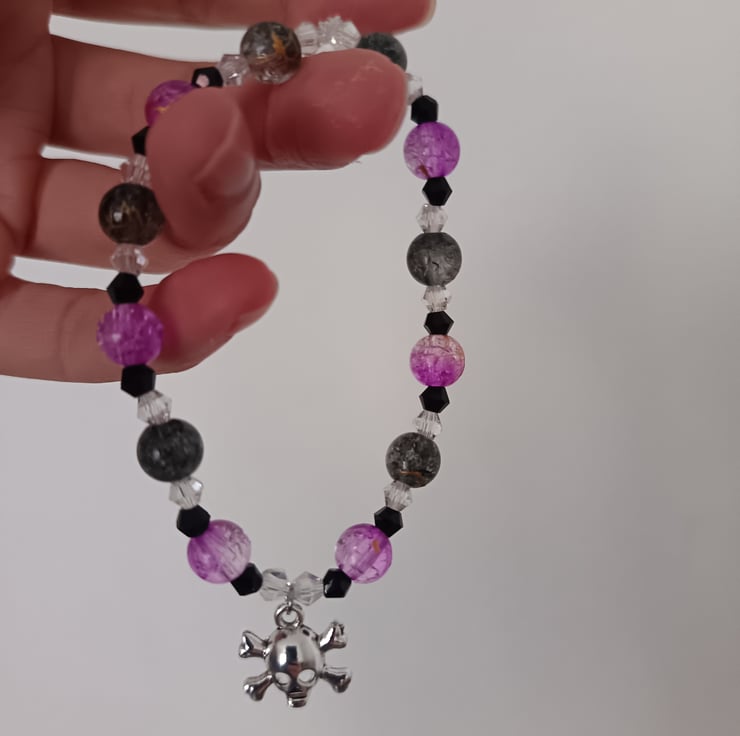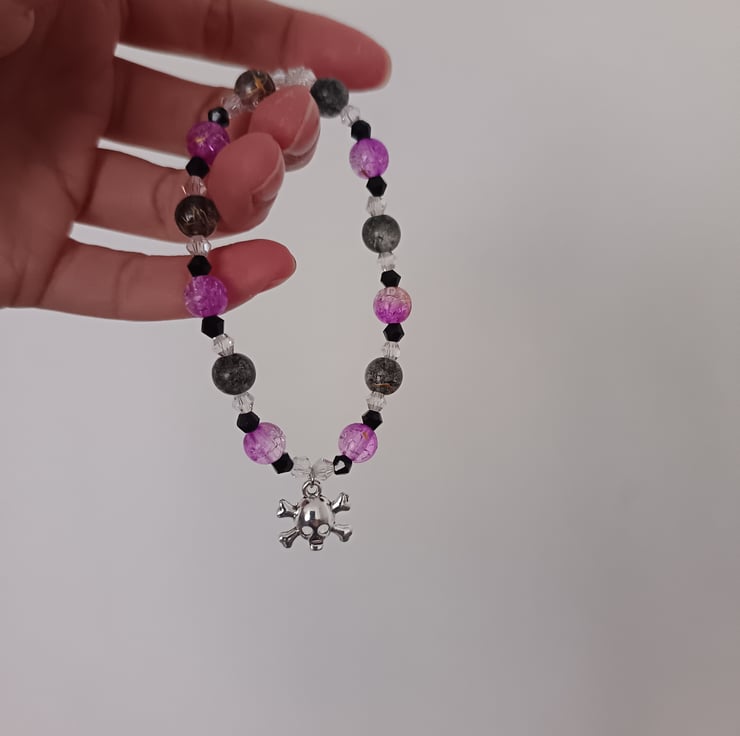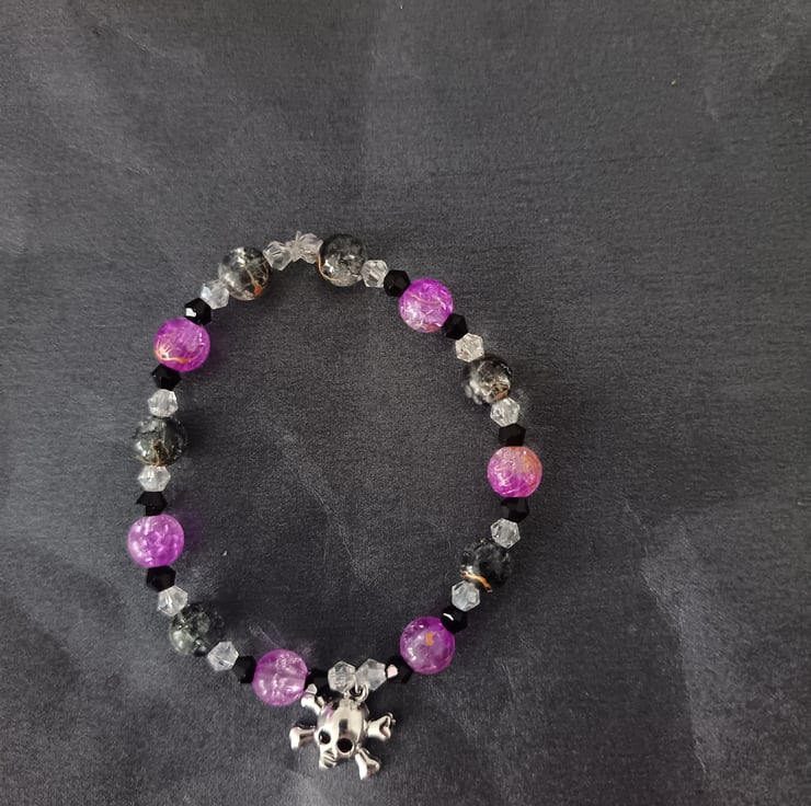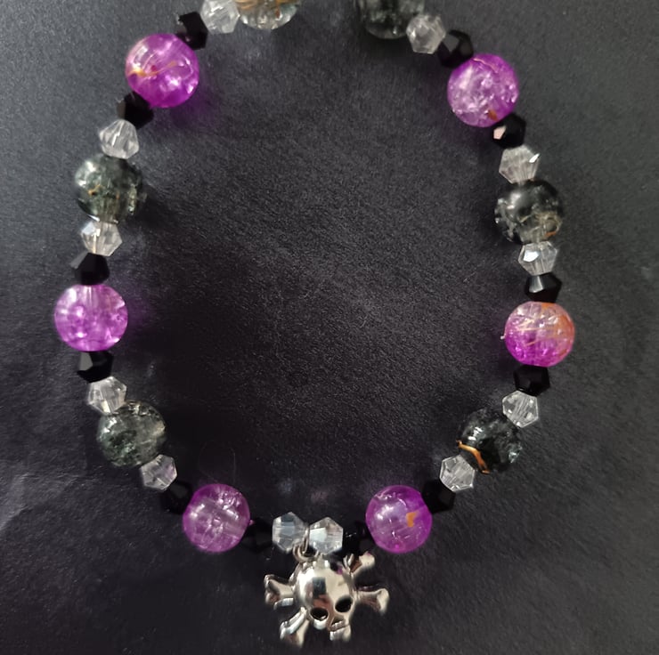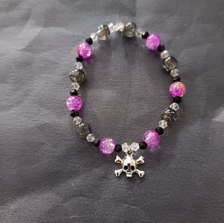 This handmade bracelet is crafted with magic stretch elastic, a stainless steel skull and crossbones charm, and glass beads in black, clear and lilac-purple.