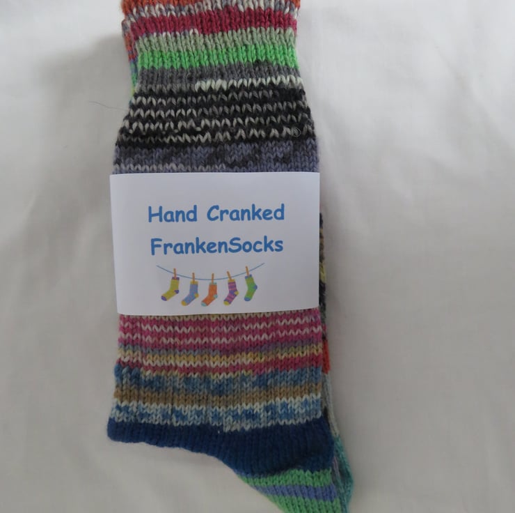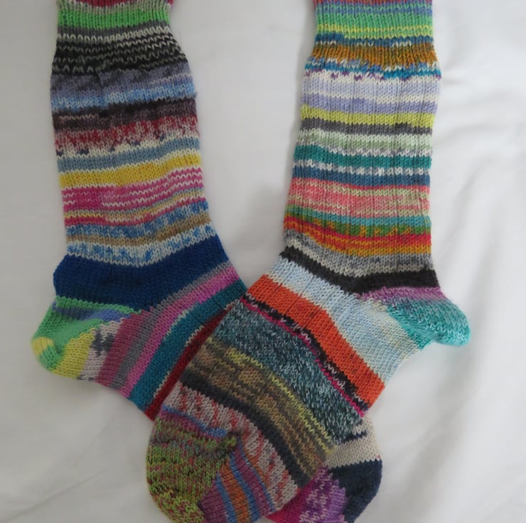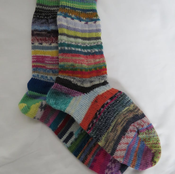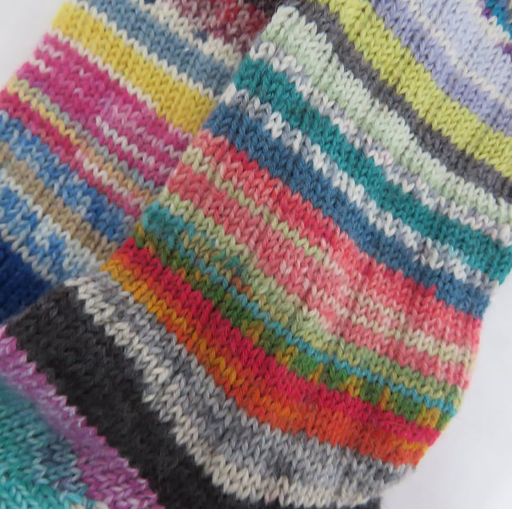 The ideal gift for someone who likes to be a bit different. Made by grafting fixed lengths of pre-dyed sock wool together in a completely random fashion. Absolutely no pattern matching!