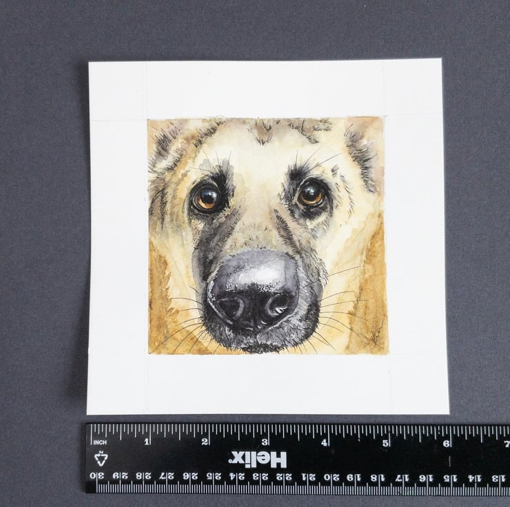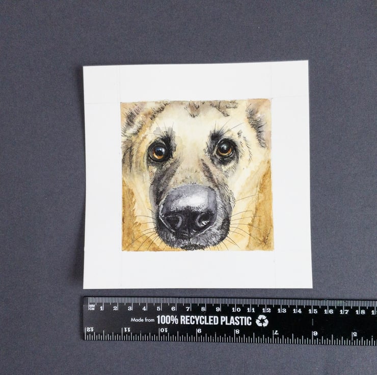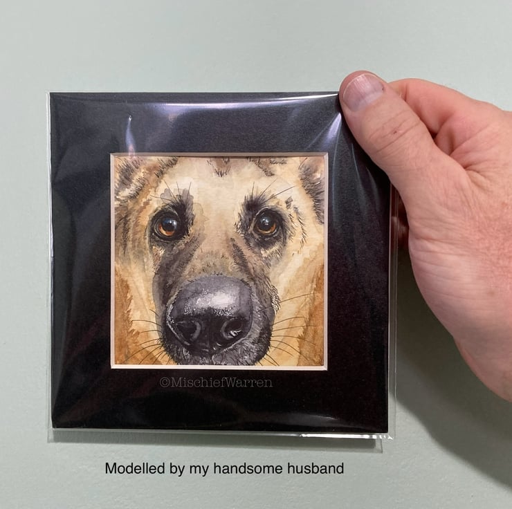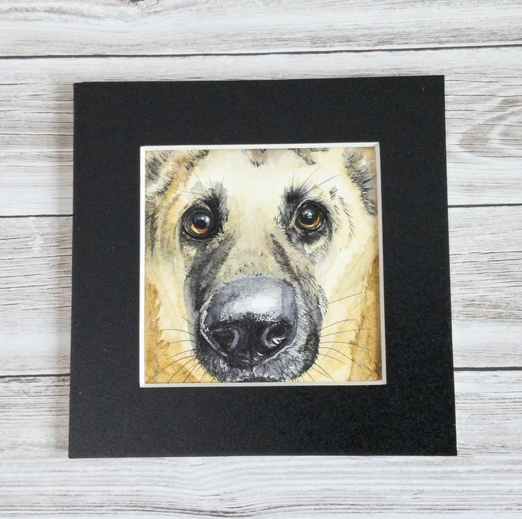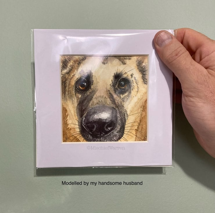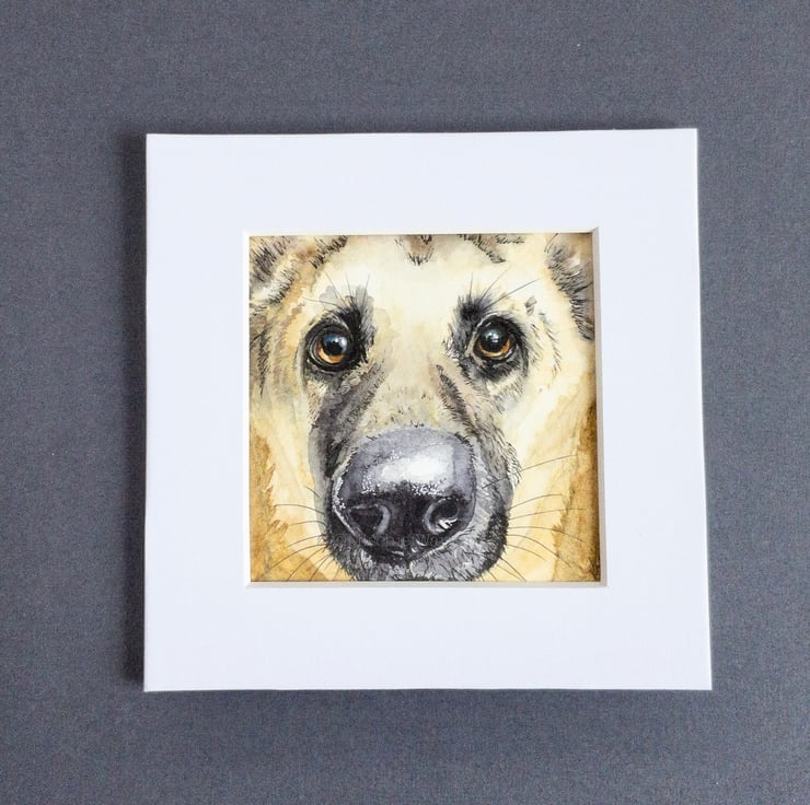 My unique hand drawn and hand painted watercolour original of my German Shepherd dog. Unframed, I include mount that fits an 6" square frame and the painting sits within a 4" square aperture. This mini art piece would make a great gift for an Alsatian dog lover; birthday or Christmas perhaps.