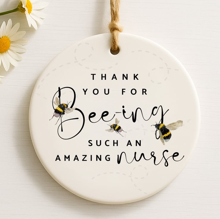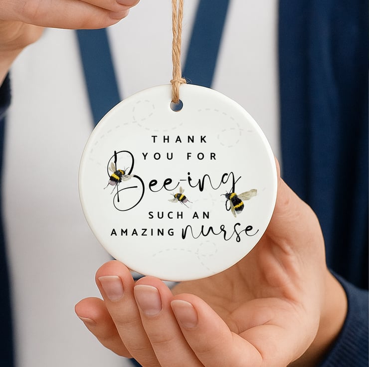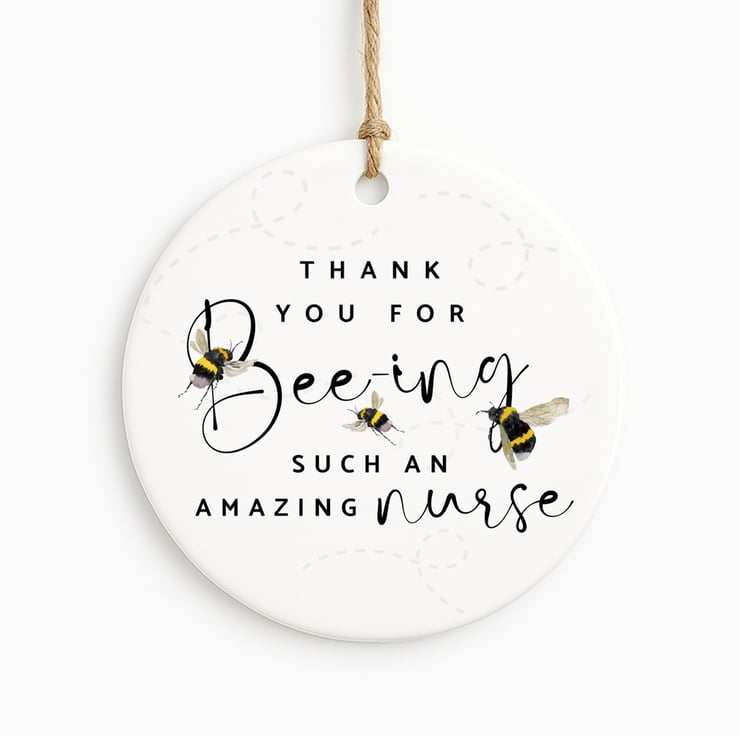 Say a heartfelt thank you with this charming Beeing an Amazing Nurse ornament. Featuring a soft neutral background with delicate bee illustrations, this keepsake is a thoughtful way to show appreciation for a nurse who truly goes above and beyond.