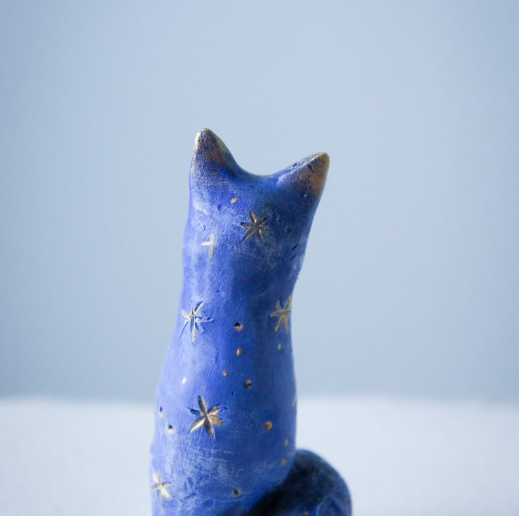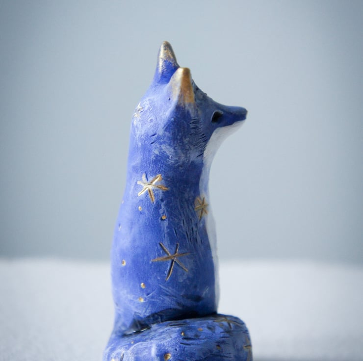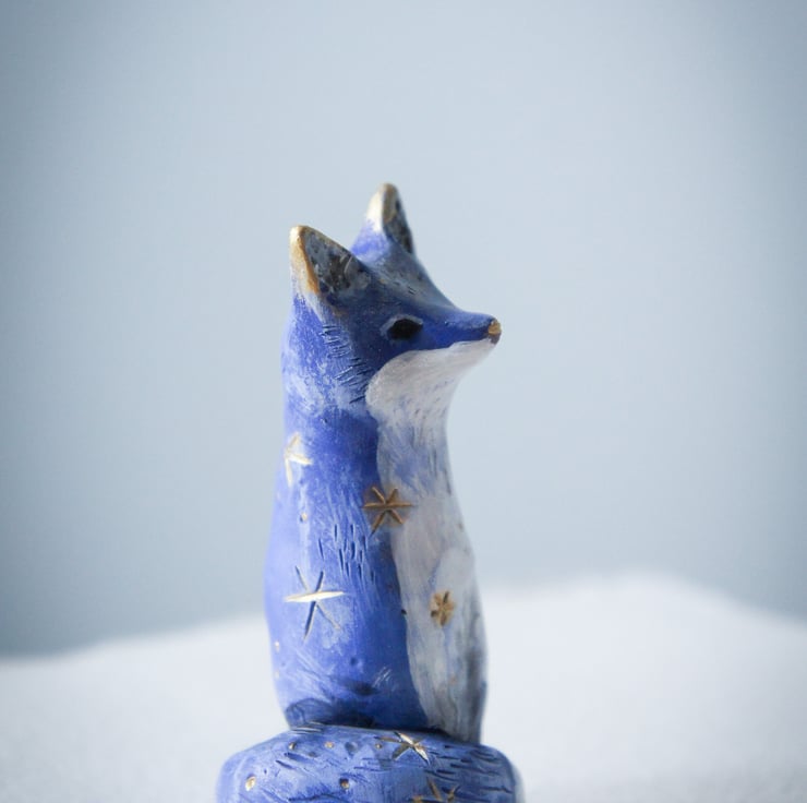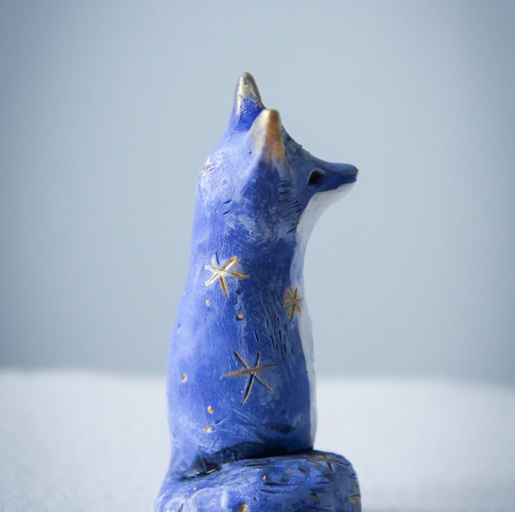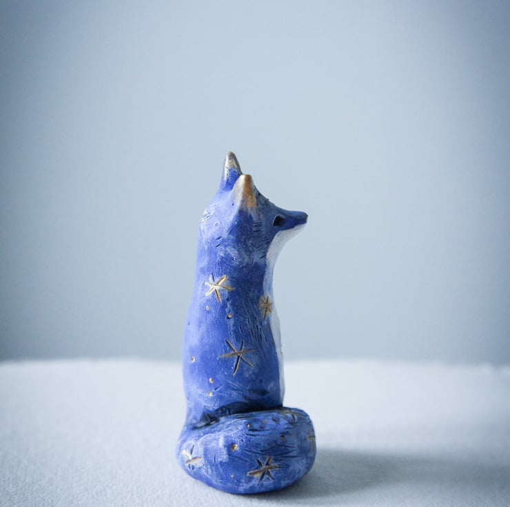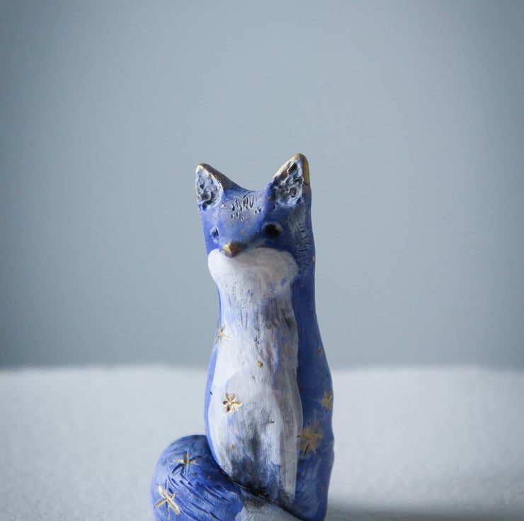 A hand-sculpted and painted blue fox with star detail. This is the exact fox that you will receive. This little fox stands at 7.5cm in height.