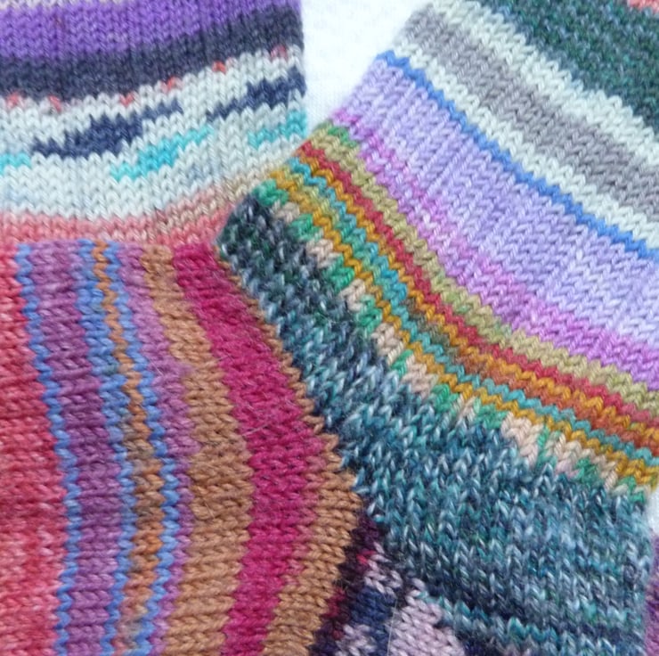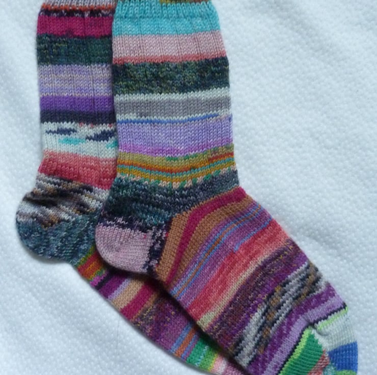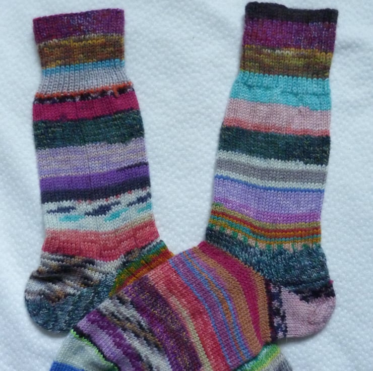The ideal gift for someone who likes to be a bit different. Made by grafting fixed lengths of pre-dyed sock wool together in a completely random fashion. Absolutely no pattern matching!