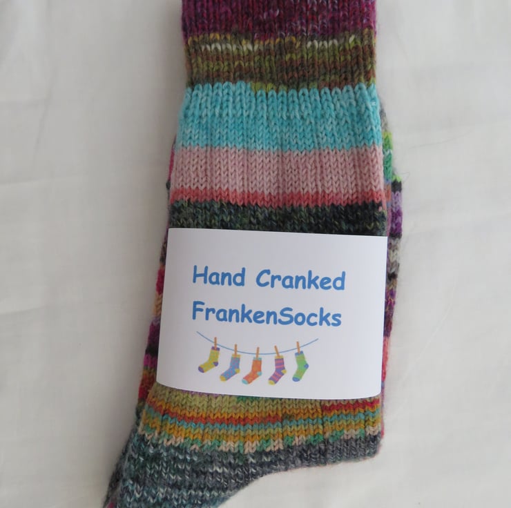 Hand-cranked Frankensox Knitted Ribbed Wool Socks Size 8 to 9