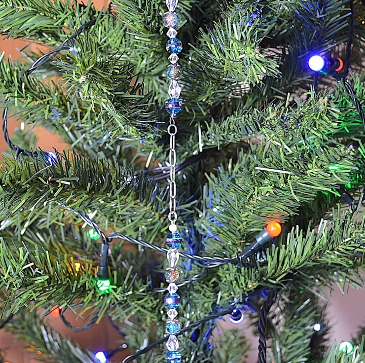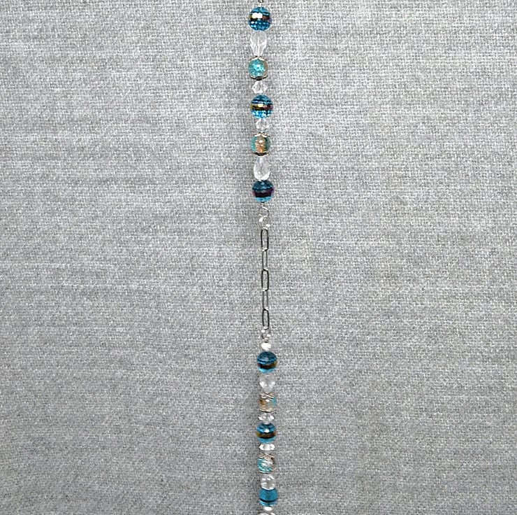 In this piece, the beaded elements are made with capped turquoise/copper crackle glass beads, glass crystal drops and bicones, and blue glass crystal beads with an AB band.