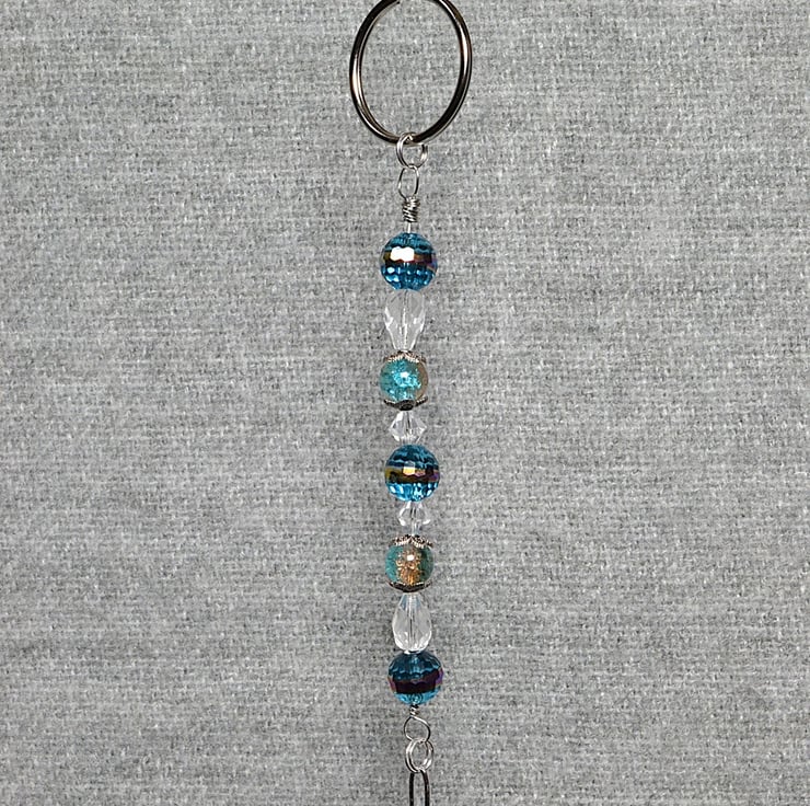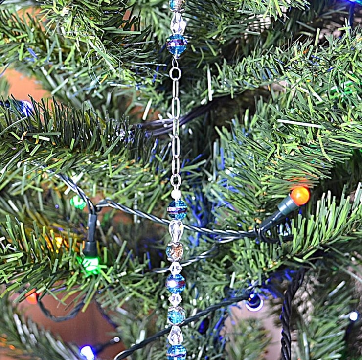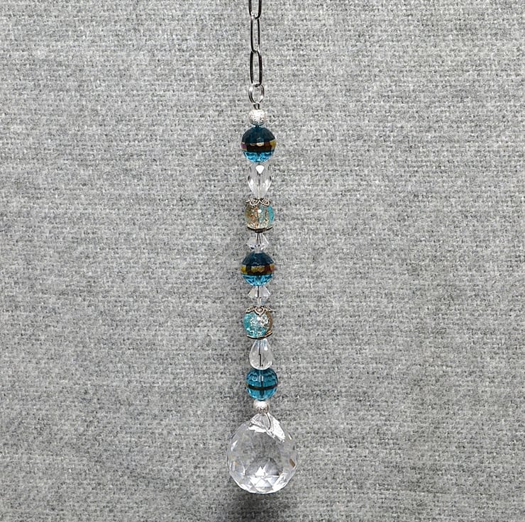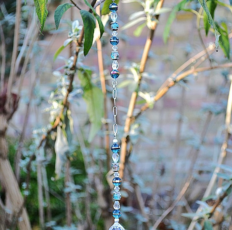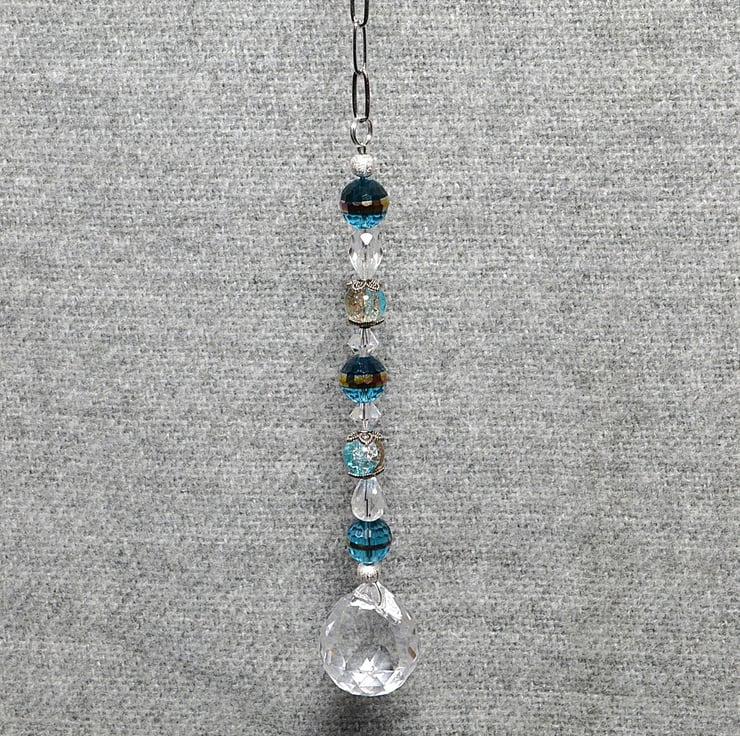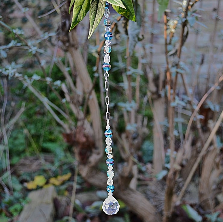 In this range, each suncatcher is made from two beaded elements joined by a short length of silver-plated paperclip chain. The element at the top is stung on wire, with a wrapped loop at each end for strength. That is finished with a large split ring loop for hanging. The element below the chain is strung on beading wire, and is finished with a chunky faceted glass crystal drop.
