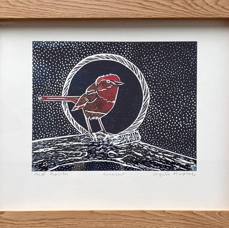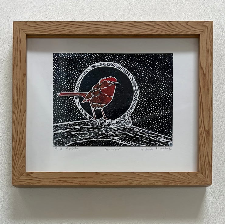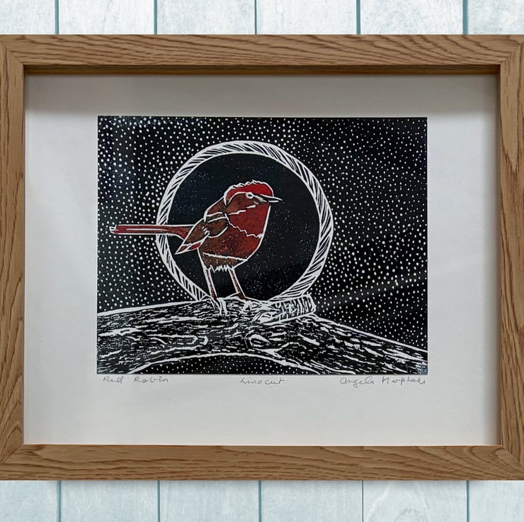 Framed red robin linoprint with hand watercolour, one in a series of prints of this design, each one unique. This one framed with glass in grainy wood.