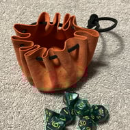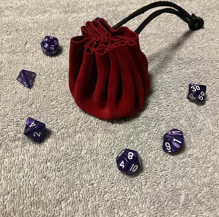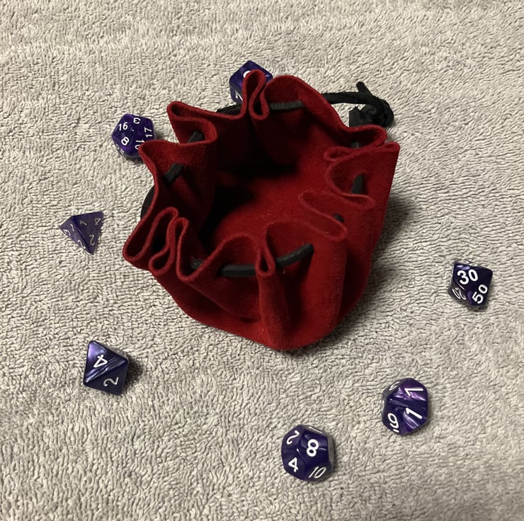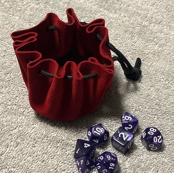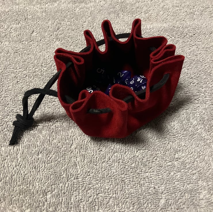 The pouch is small, but big enough for at least 3 sets of dice (if you have 7 dice in a set). It’s a great size as you can toss it into another bag or tie it off on a belt for easy transport.