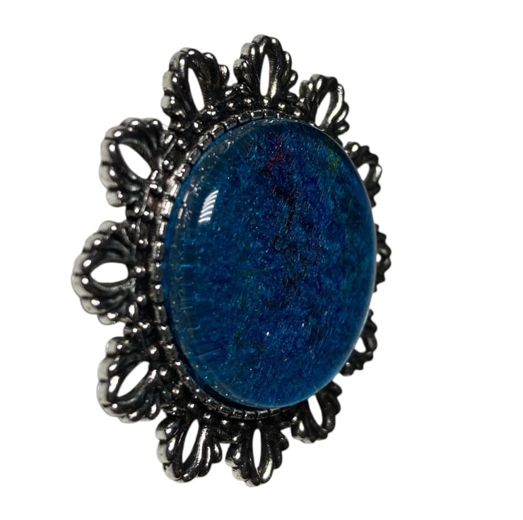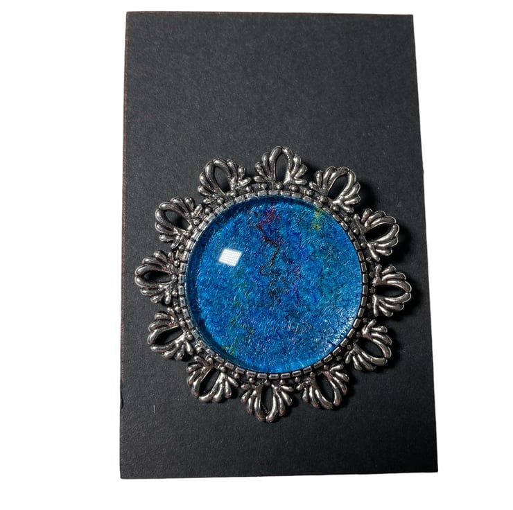 The brooch tray is made of a metal alloy that is resistant to discolouration and measures approximately 4 cm in diameter. A metal brooch pin is affixed to the back. The brooch will arrive mounted on a piece of black card.