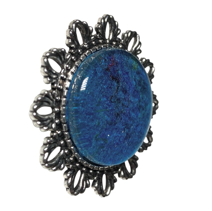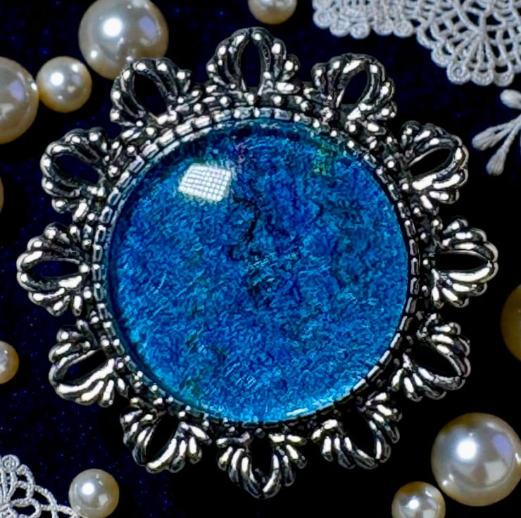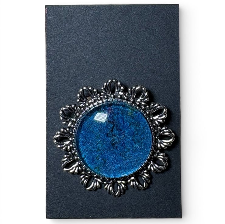 The brooch tray is made of a metal alloy that is resistant to discolouration and measures approximately 4 cm in diameter. A metal brooch pin is affixed to the back. The brooch will arrive mounted on a piece of black card.