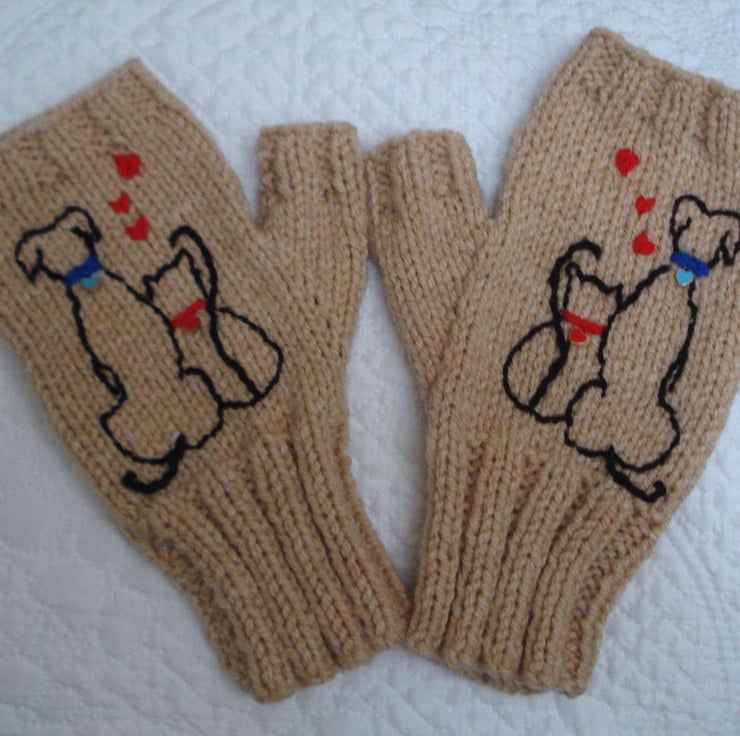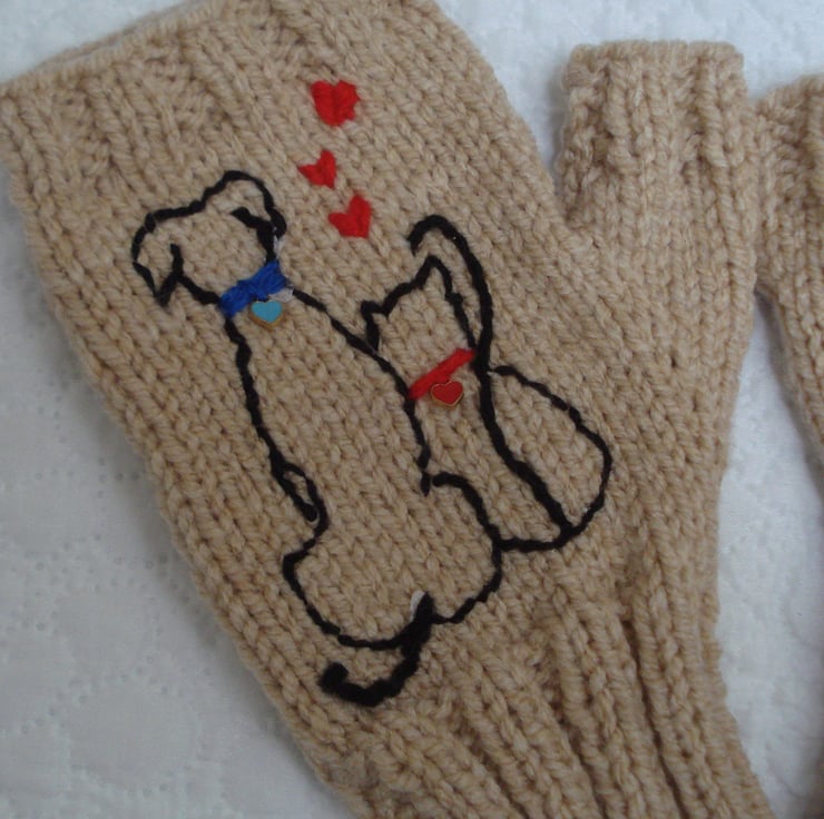 This is a pair of hand knitted gloves which have been embroidered with a dog and a cat sitting side by side. The gloves are a nice terracotta colour, the dog has a blue collar with a blue heart and the cat has a red collar with a red heart. Would fit a medium to large hand, 22cm long.