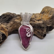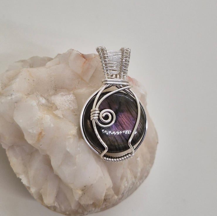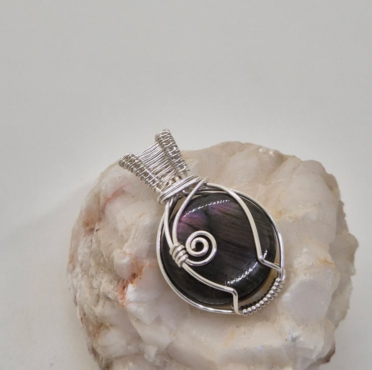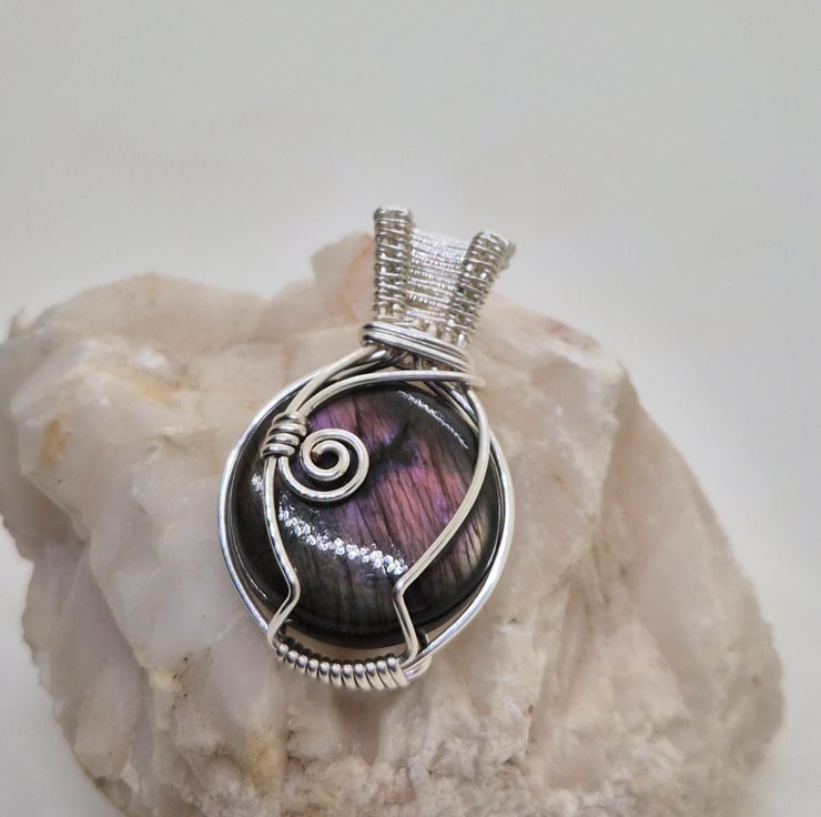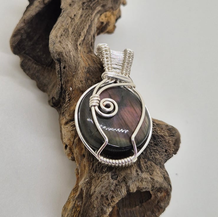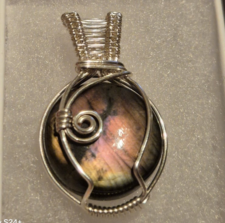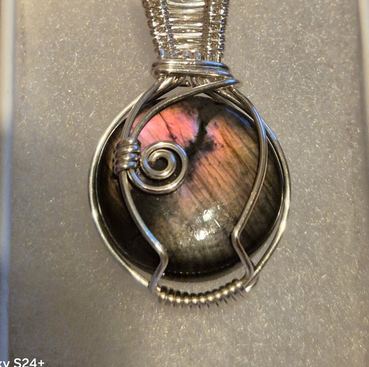 Gorgeous pink, yellow flashes on this labradorite, hand wrapped with silver plated wire in a beautiful swirl design.