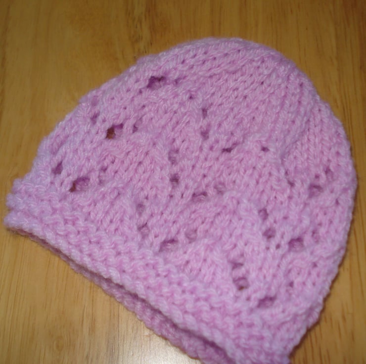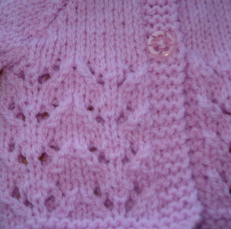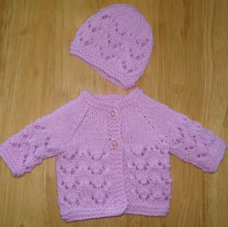 This is a pretty cardigan and hat for a 14" doll approximately please see measurements. Hand knitted in acrylic yarn with two pink plastic buttons at the front of the jacket. Sizes: Chest 30cm back length 16.5cm sleeve length from under arm 8cm. Hat will stretch to 24cm round and 10cm tall. Could fit premature baby.
