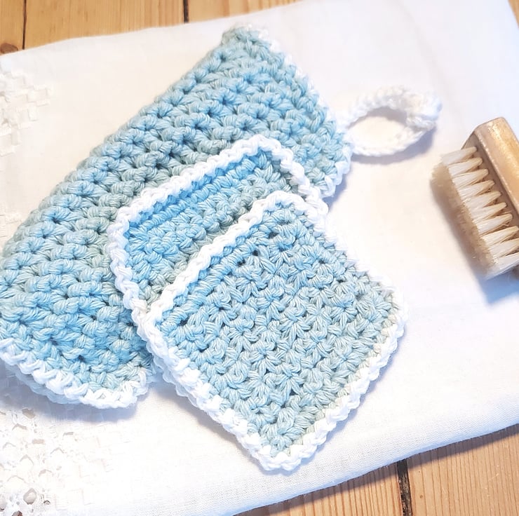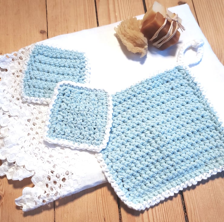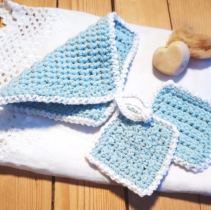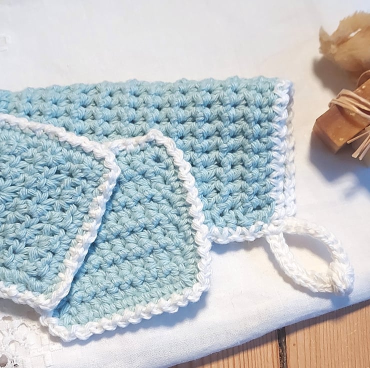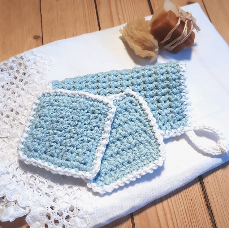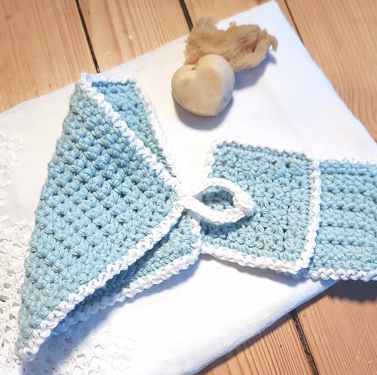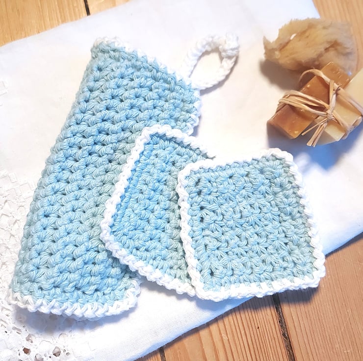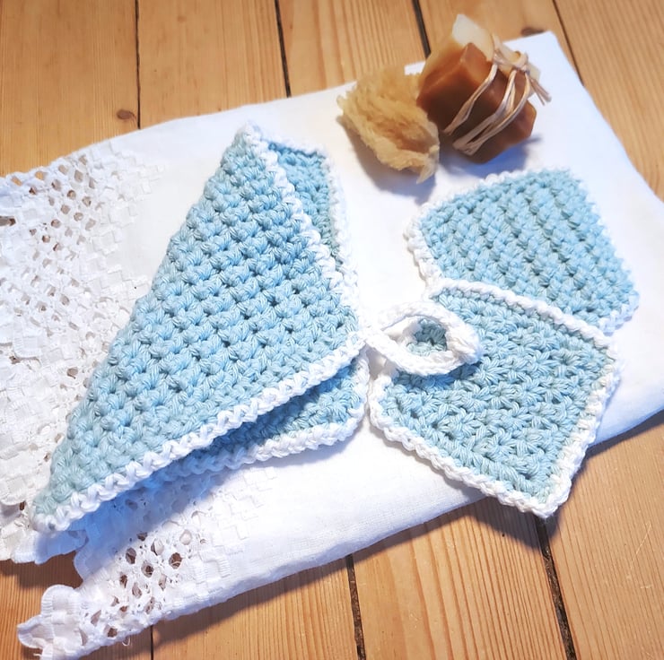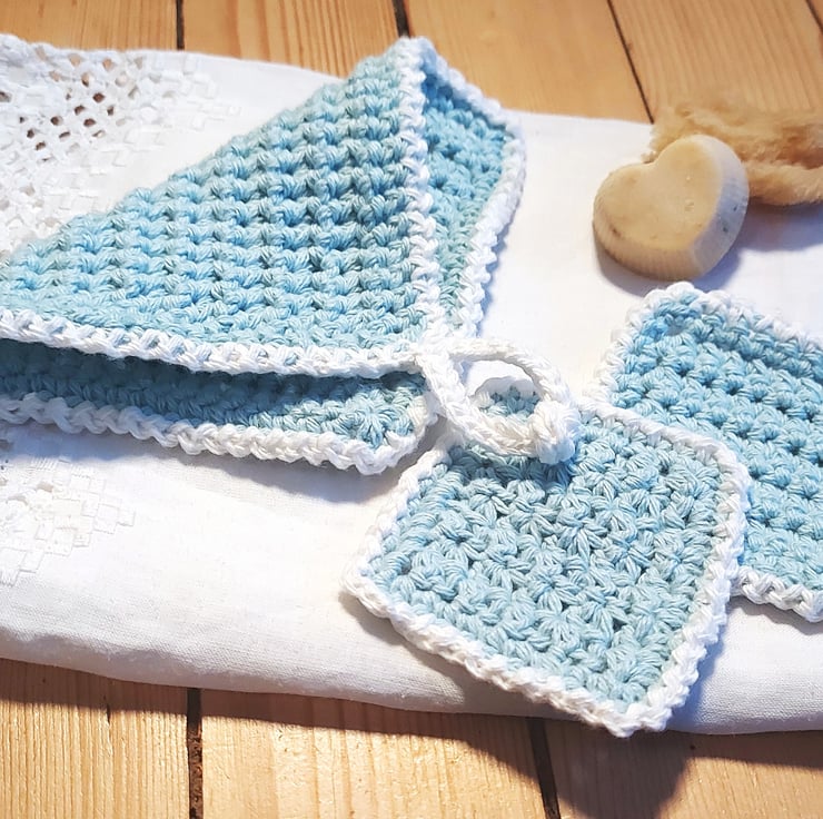 A lovely set of one washcloth-face cloth and two scrubber makeup removal pads in a fresh aquamarine colour with a white border. Handmade with soft 100% recycled cotton, with a practical loop on the washcloth for hanging up.