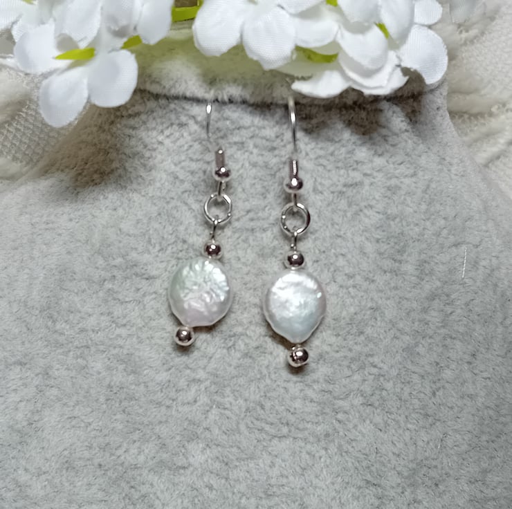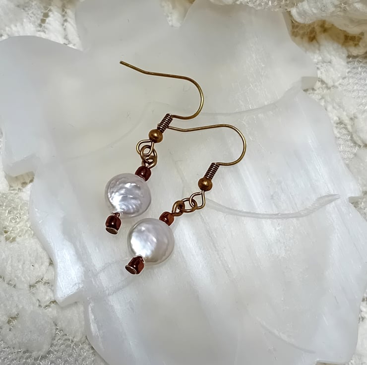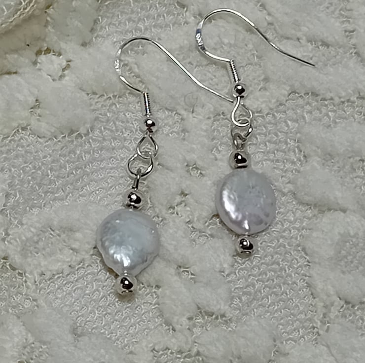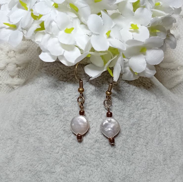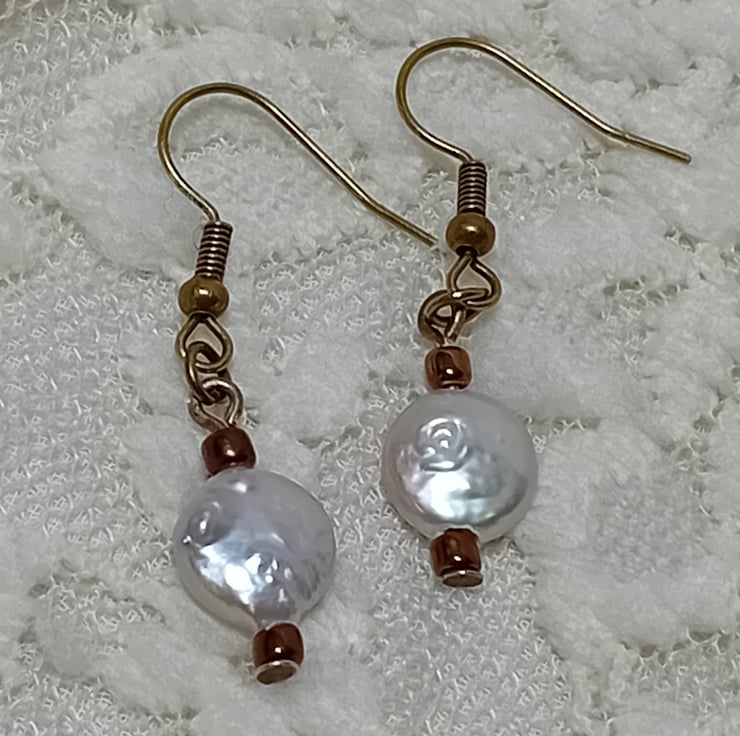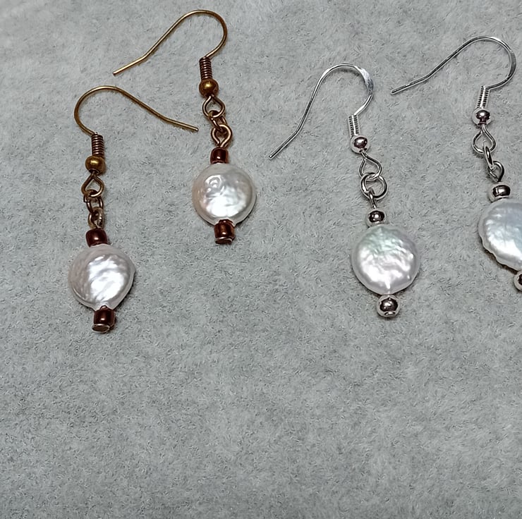 These exquisite, genuine freshwater pearls are available in two elegant settings. The pearls showcase a Baroque style and measure approximately 10mm. They are delicately suspended on Sterling Silver "fish hook" ear wires with 2mm Sterling Silver beads or on Bronze "fish hook" ear wires with bronze beads. Simply select your preferred option from the dropdown menu.