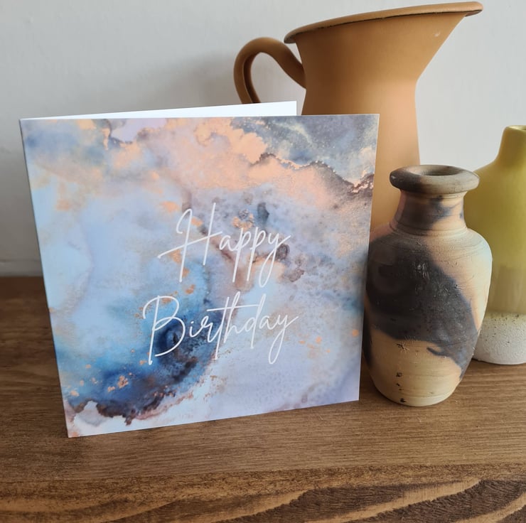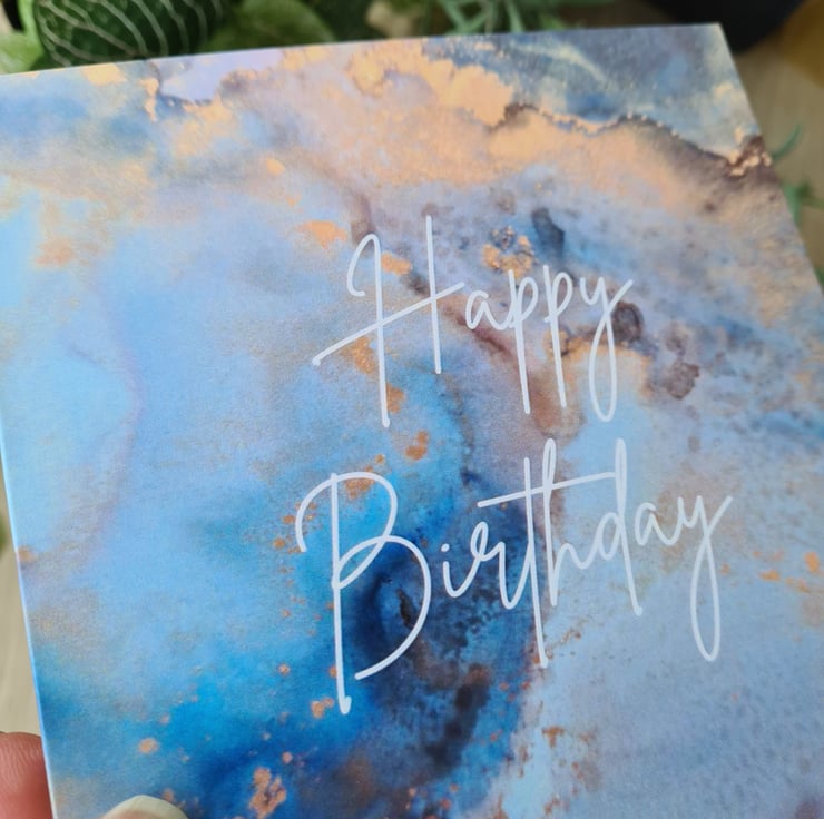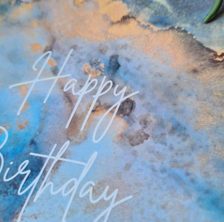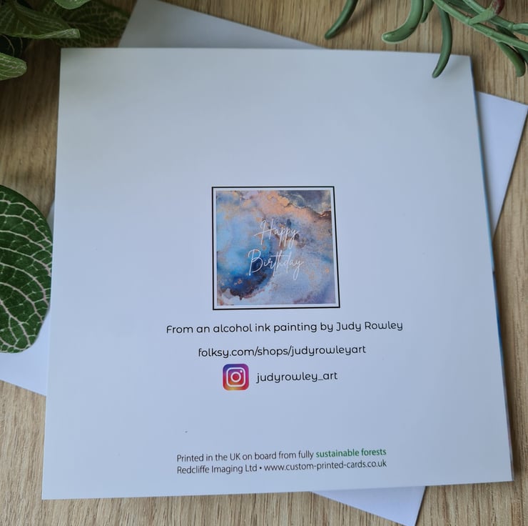 This card is a print from one of my original alcohol ink paintings with stylish dark blue and gold colours. It has been professionally printed on quality card.