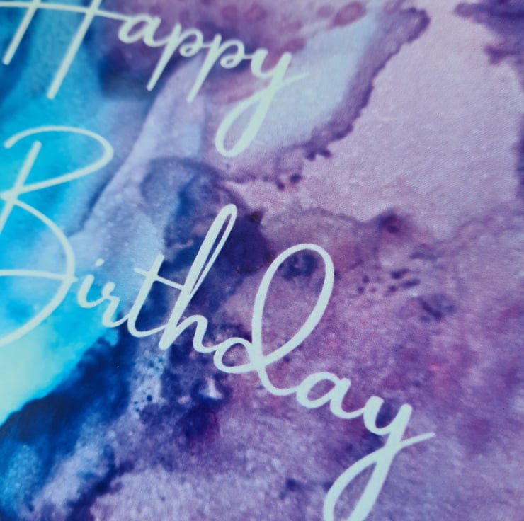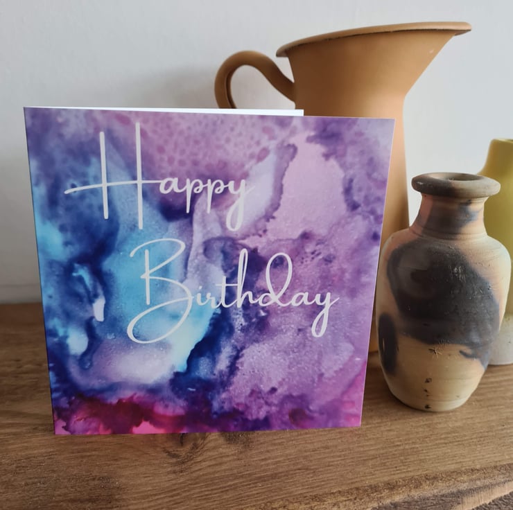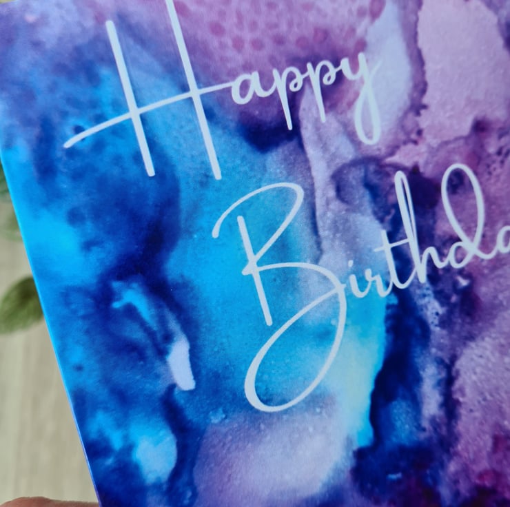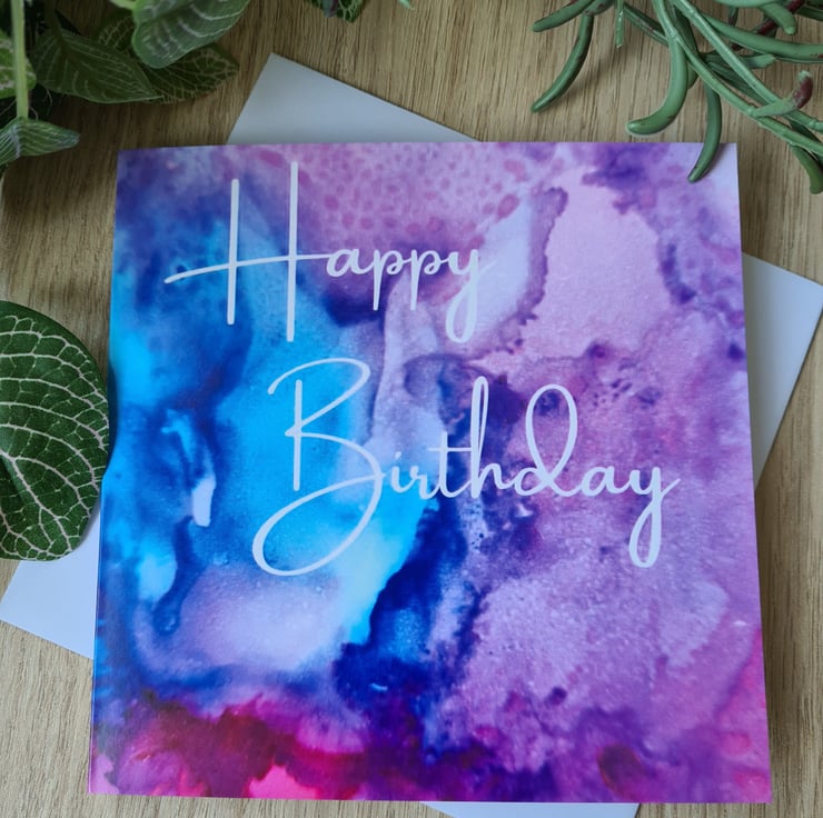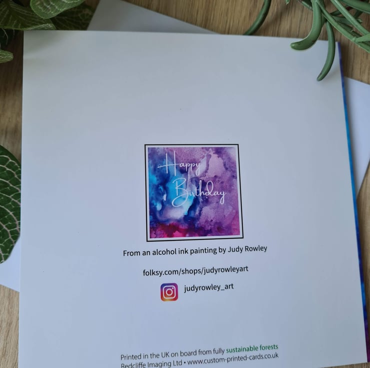 This card is a print from one of my original alcohol ink paintings with pretty blue, purple and pink colours. It has been professionally printed on quality card.