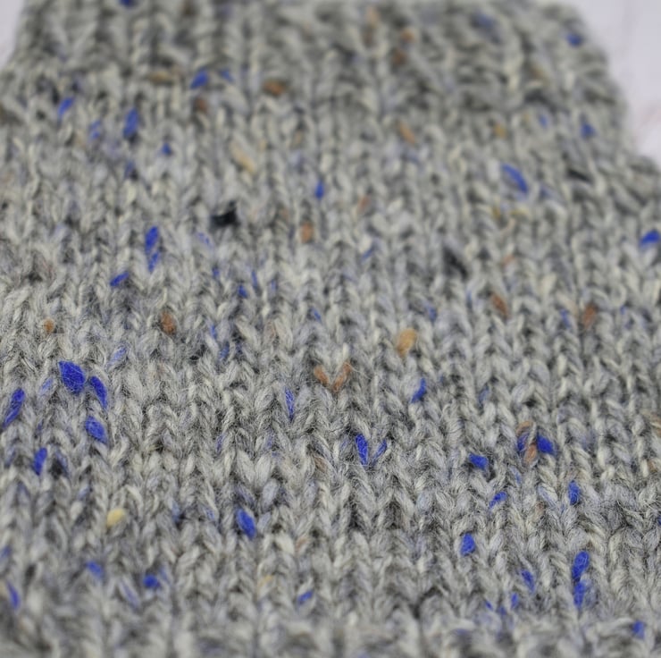 I have used Scottish marled lambswool which will bloom and soften up even more when hand washed. The yarn his grey with blue and brown flecks which knits up to a marled finish.