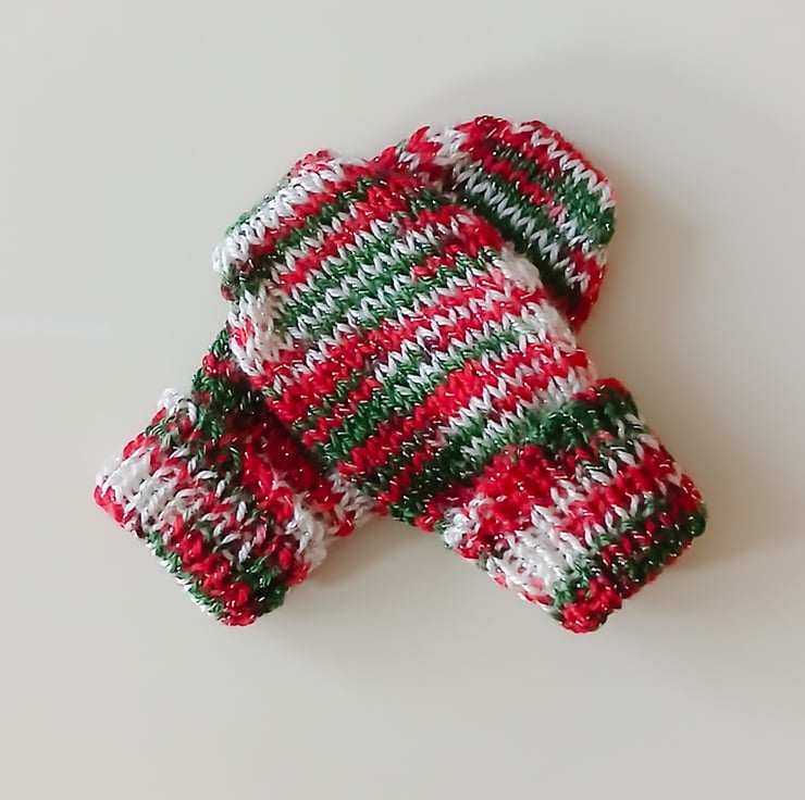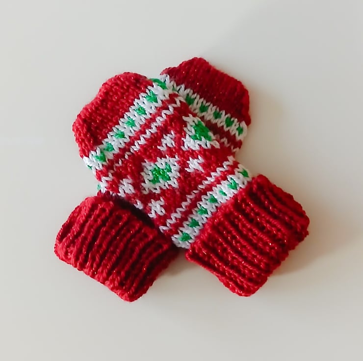 Yarn and colour: They are knitted using King Cole Glitz Double Knitting yarn in shades, Flame, Green, White, Jet, and Christmas. The yarn is a supersoft, premium acrylic with a 3 per cent polyester glitter thread.