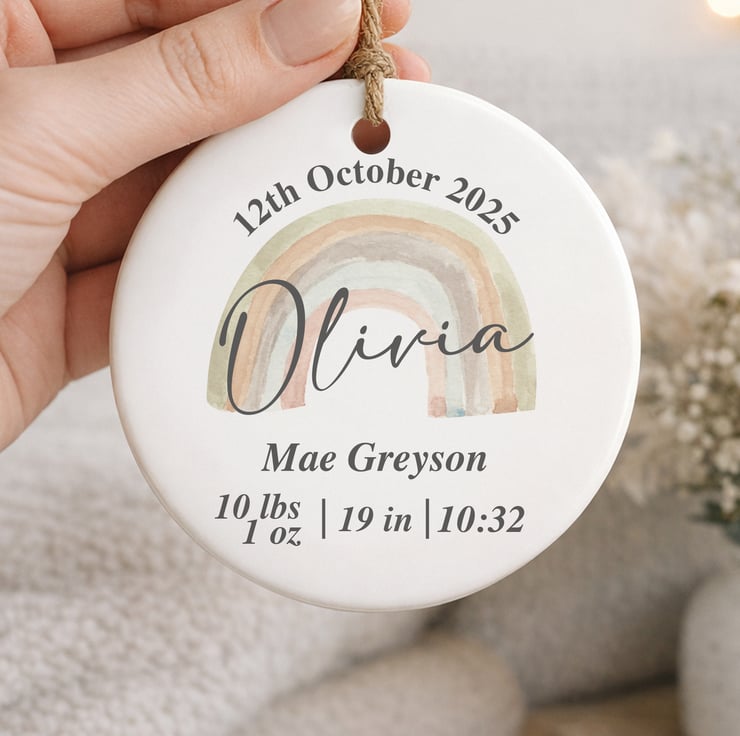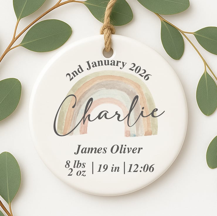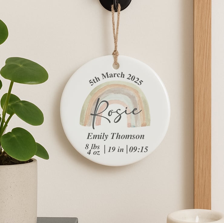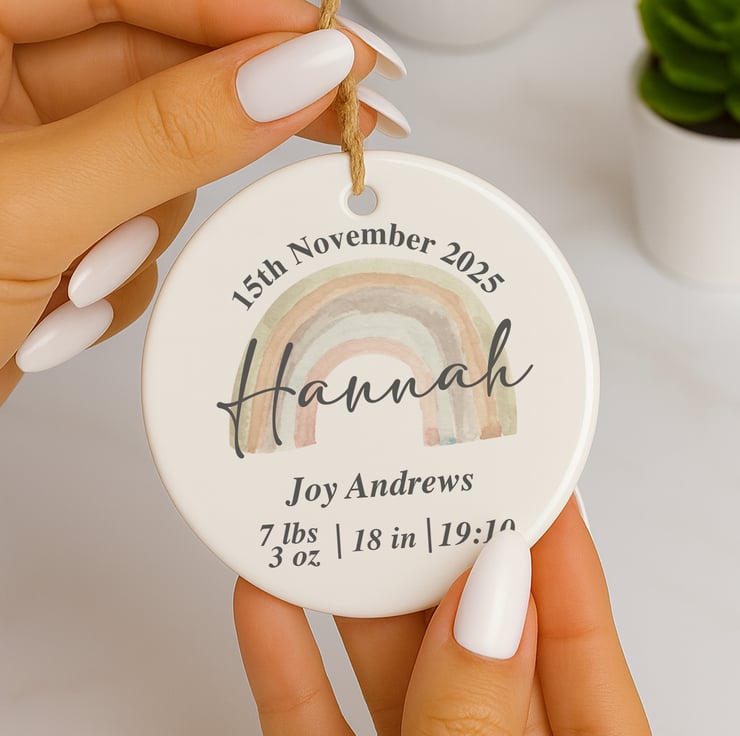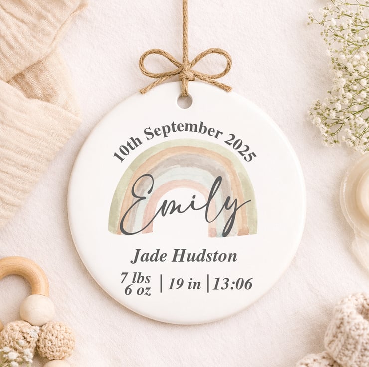 This personalised baby stats ornament features a soft watercolour rainbow design, symbolising love, hope and new beginnings. Customised with your baby’s birth details, it makes a meaningful keepsake for new parents and a beautiful addition to a nursery or memory wall.