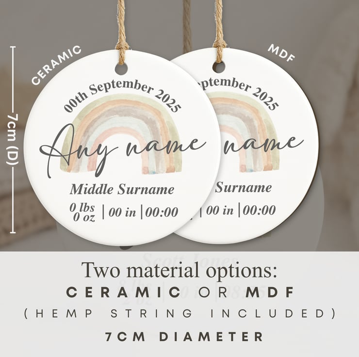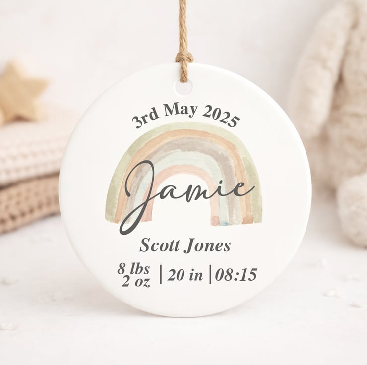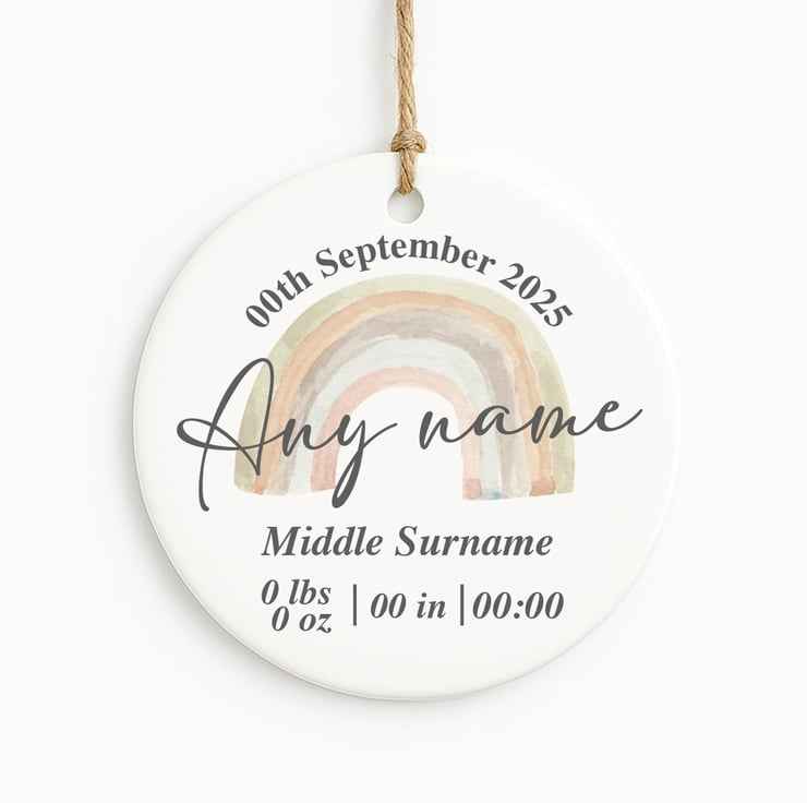 - Personalised baby stats ornament with watercolour rainbow artwork