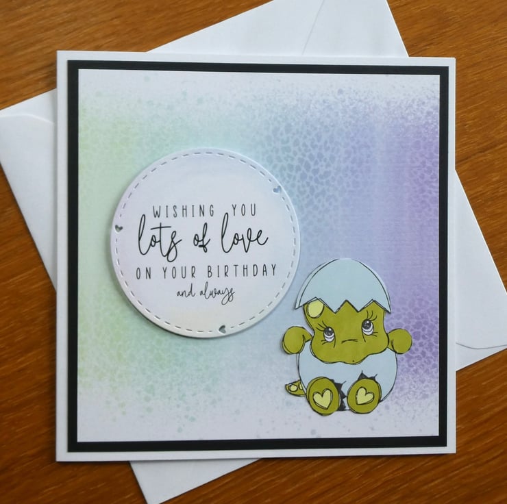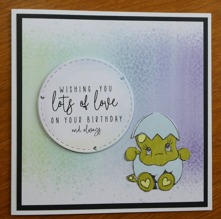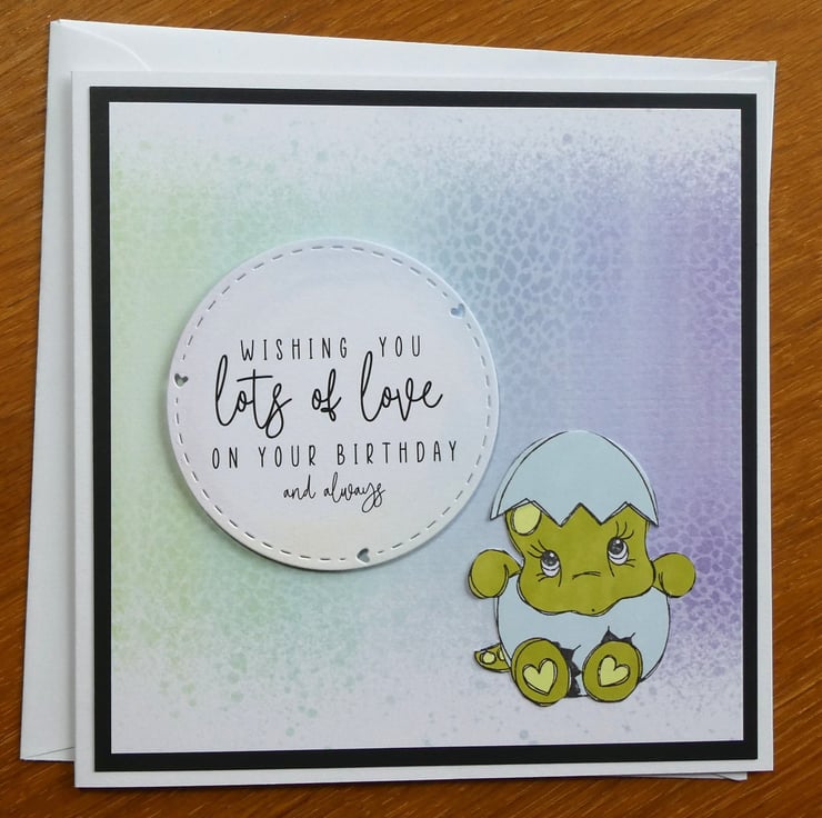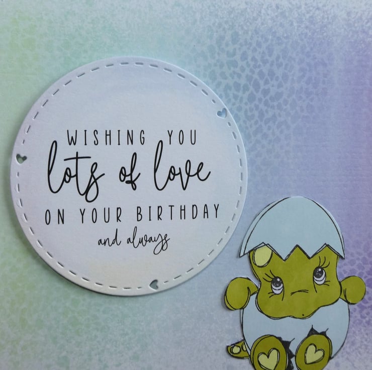 This cute dinosaur birthday card has a sweet image of a dinosaur hatching from an egg and the message 'Wishing you lots of love on your Birthday and always'.