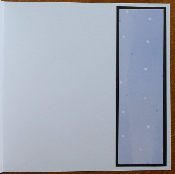 The design has been finished with a frame of black card and mounted onto a white card measuring 14.8cm square. Inside the card is a strip of lilac and white heart patterned paper with a black card frame down the right hand edge.