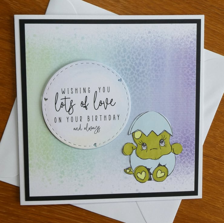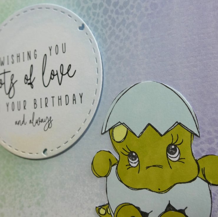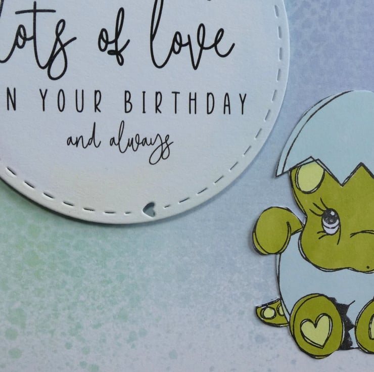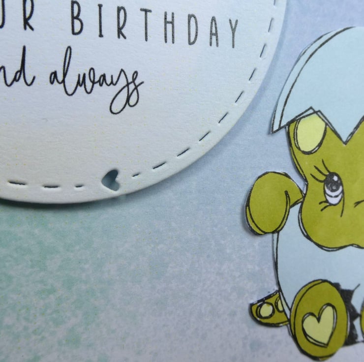 It features a cute dinosaur just hatching from an egg, which has been hand stamped, inked in shades of blue, lime and moss green and carefully cut.