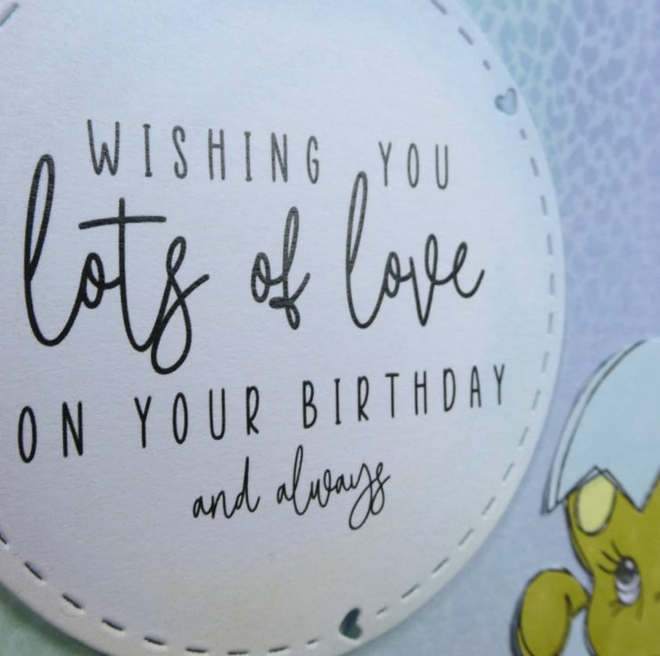A circular die cut message with the message 'Wishing you lots of love on your Birthday and always' on a pale pastel background has been raised on foam pads to add dimension on the left hand side.