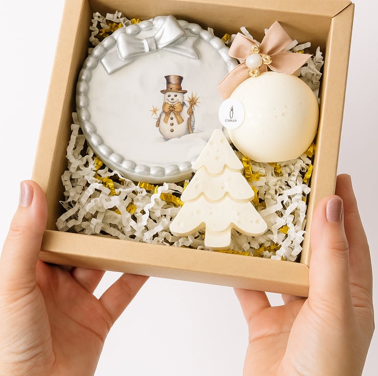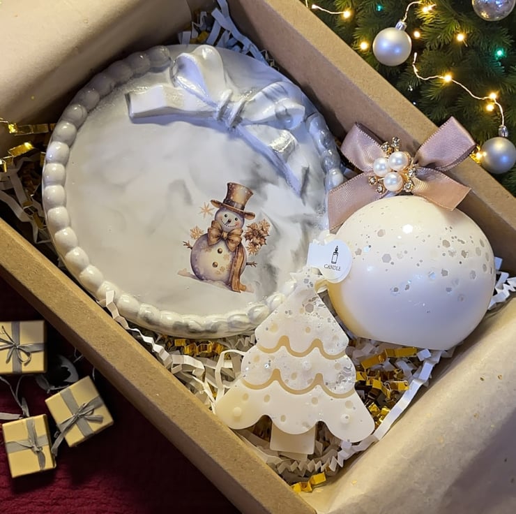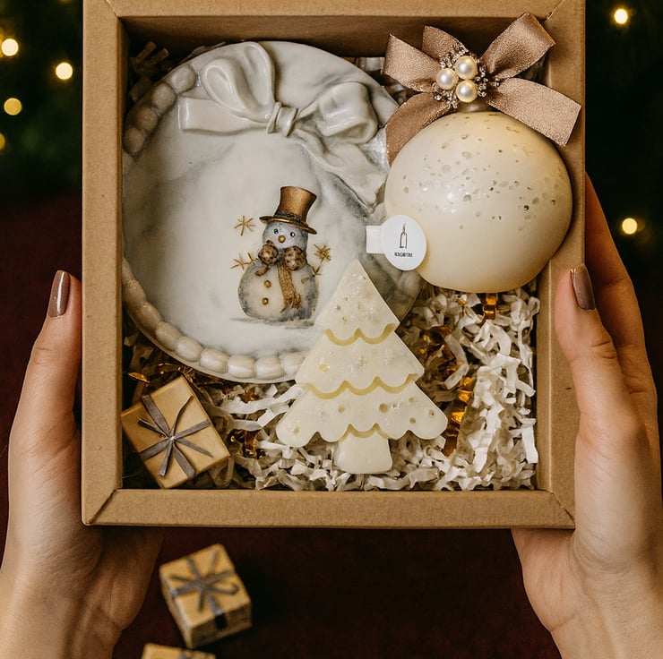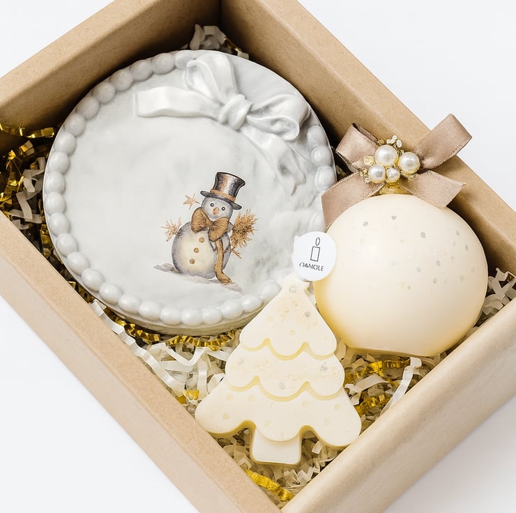 This elegant Christmas gift set includes a selection of handmade soy wax candles paired with a decorative gypsum tray, carefully arranged in a gift box with festive filling.