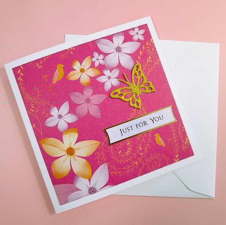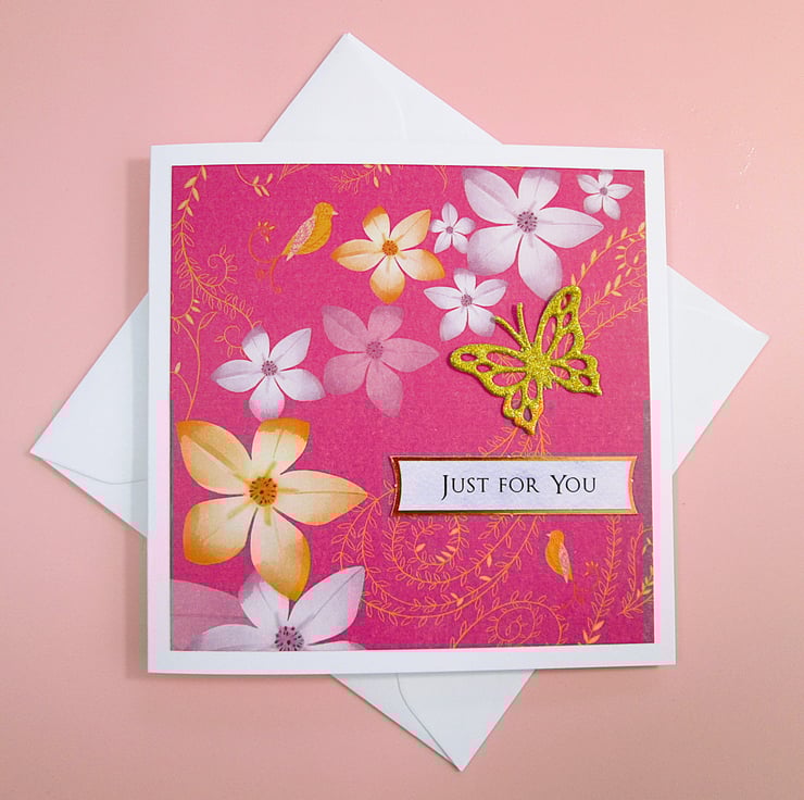 A lovely floral butterfly card saying Just for you. A card for any occasion like a birthday, get well soon, thank you, Mothers Day or even a Valentines card. Made with cardstock and pretty scrapbook paper mounted onto a square card which is blank inside for your special message. The wings on the butterfly can be gently lifted to create a 3D effect.