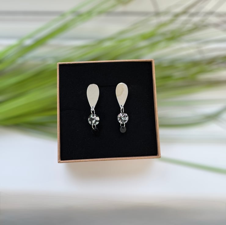 Mirrored silver tear drops, circle of black and silver holographic flecks with a micro black marble finishing circle