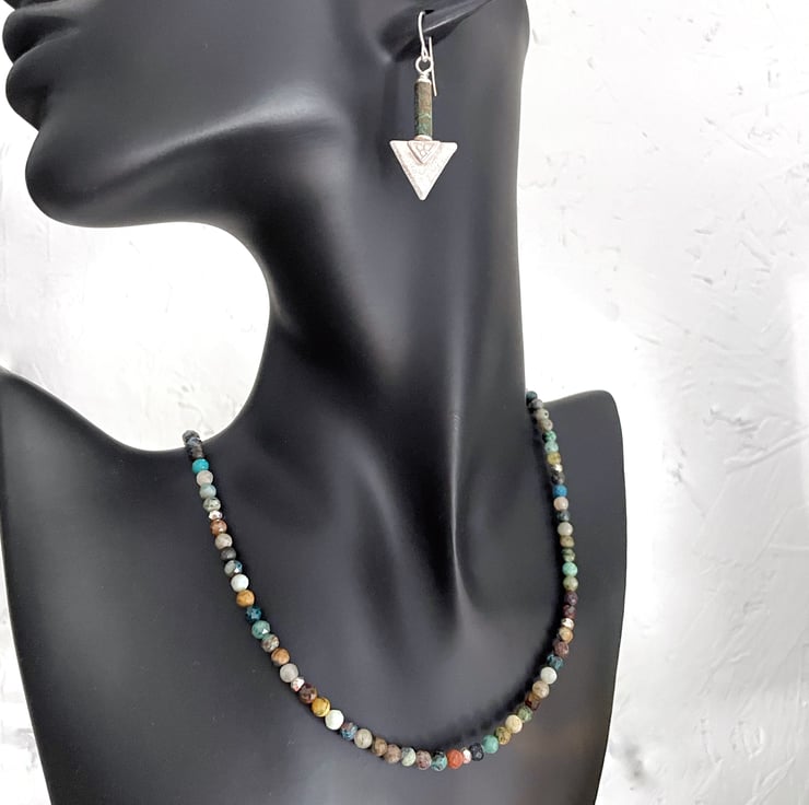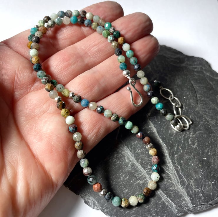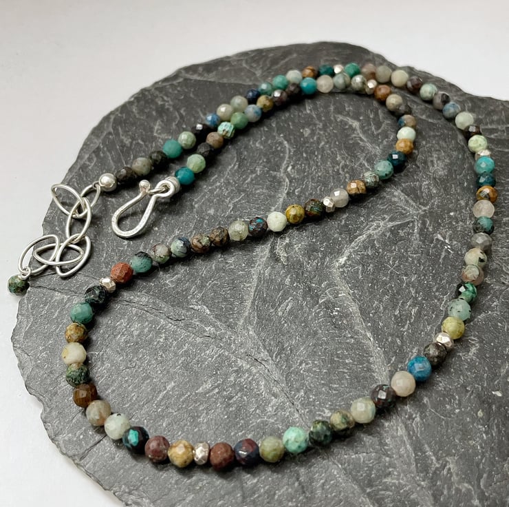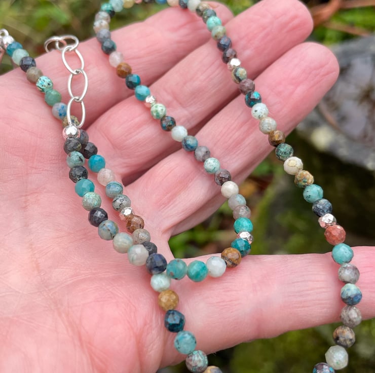 Sparkling faceted silver and chrysocolla beads have been combined to make this necklace.