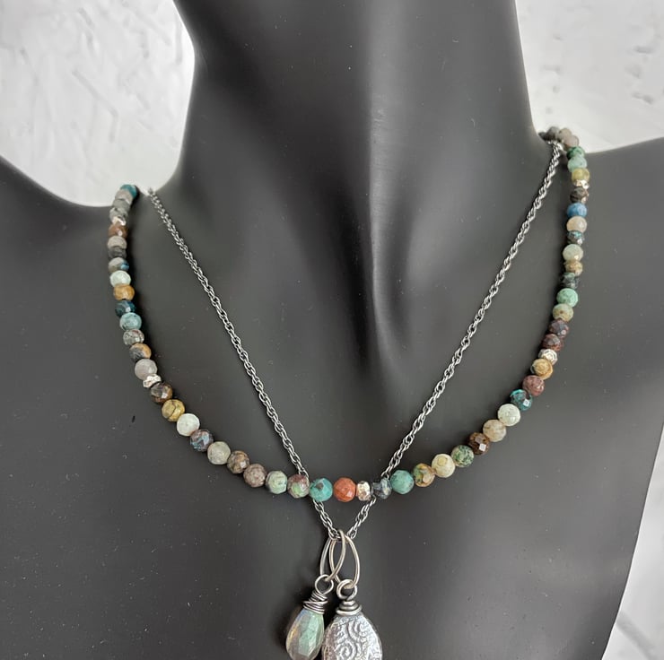 The necklace closes with a handmade hook and chain, that allow the necklace to be worn between about 17” and 19”