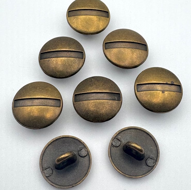 These Packs of 8 Central Striped Design Old Brass Metal Buttons are 15mm wide.