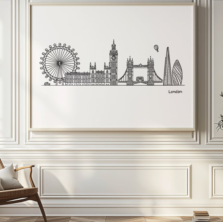Bring a little piece of London into your home with this hand-drawn skyline illustration. Featuring iconic landmarks, London Eye, Big Ben, Tower Bridge and modern city architecture, this minimalist line artwork captures the charm and rhythm of the capital in a timeless style.
