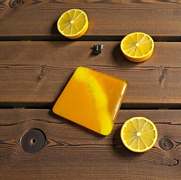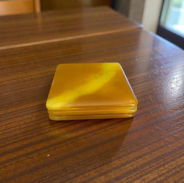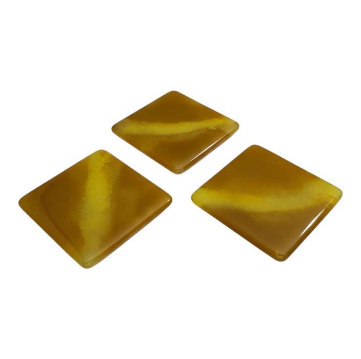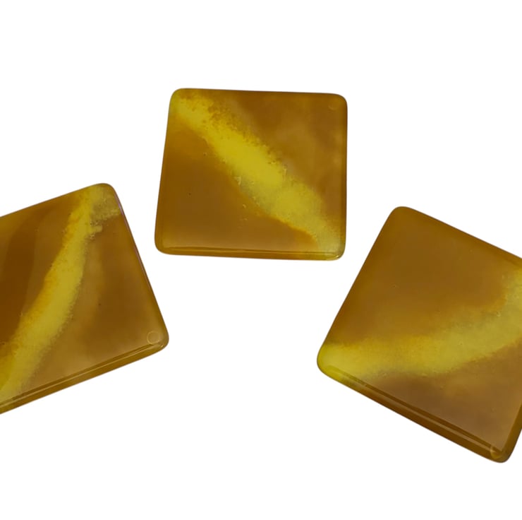 Handmade fused glass coasters. These coasters are completely unique and come in a set 3. They measure 10 cm by 10 cm and any cup or mug will fit on it well. There are rubber stops on the bottom to protect your furniture. I have used double glass so it is 6mm thick so that when you put your cup or mug on these coasters won’t break. Washing instructions, please don’t put in a dishwasher or submerge in water. Clean with a damp soft cloth for best cleaning results.