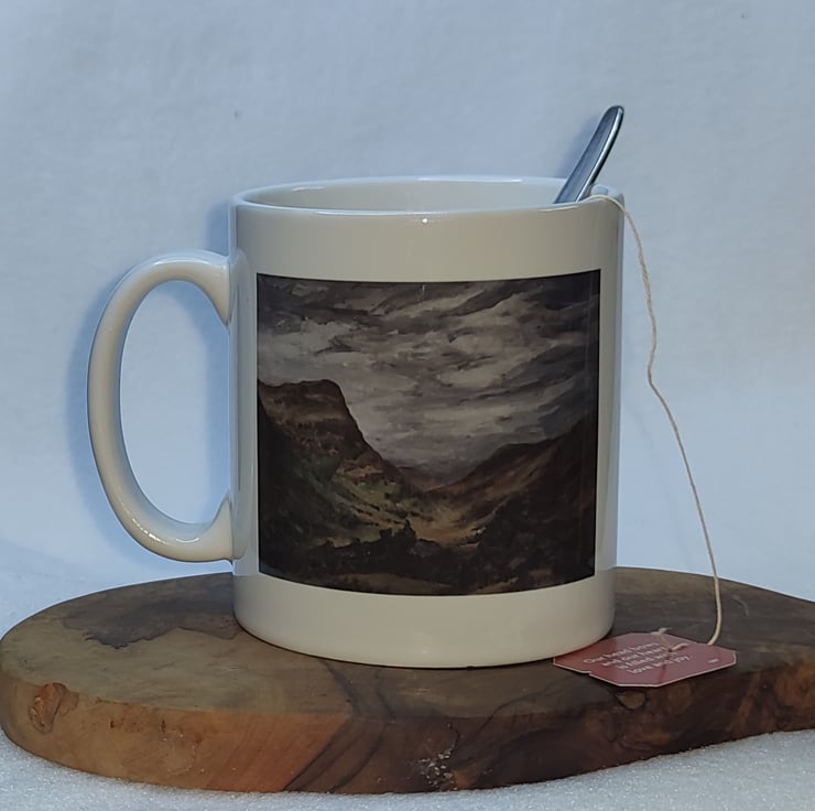 This landscape has fascinated me for years now, the highlands are so full of history and legends with nature still being the biggest character present. Even on days where the weather closes in it still retains it magic for me. Printed on both side of the mug this print plays on the relationship between the landscape and the weather that helps shape it.