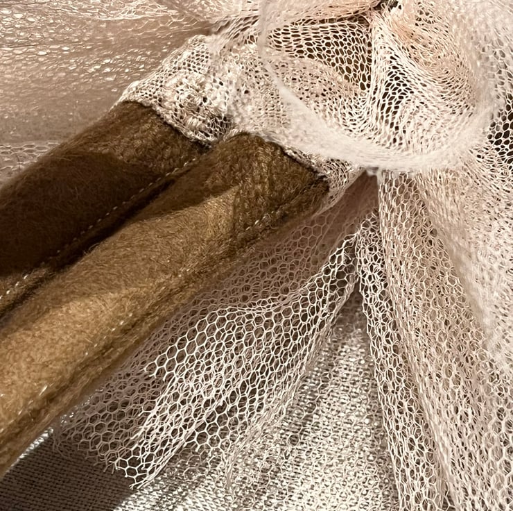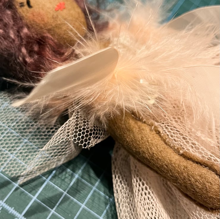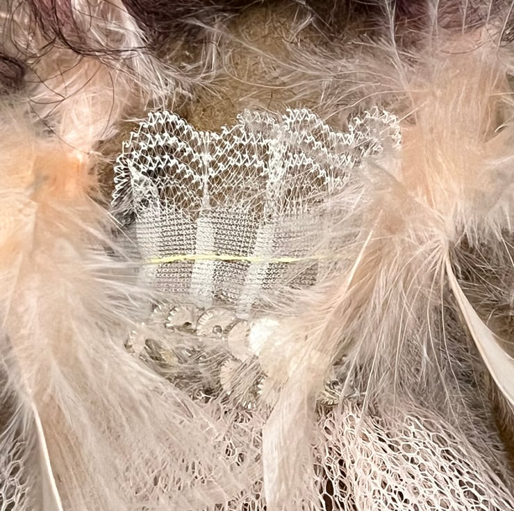 Yulia’s face is embroidered by hand. Her hair is made from wool fleece. She is dressed in lace, tulle and sequins and wrapped in a feather boa.