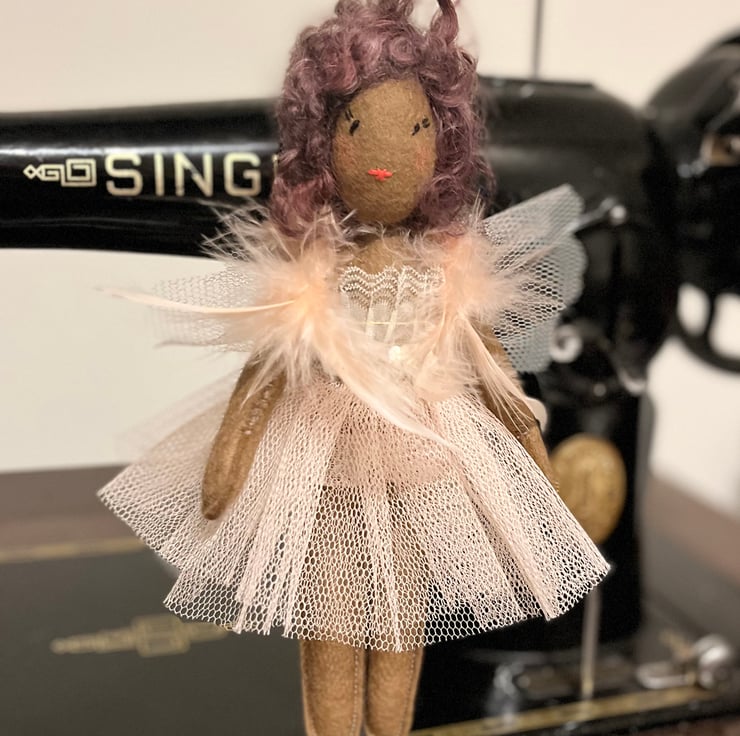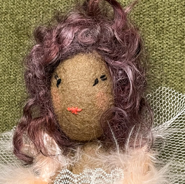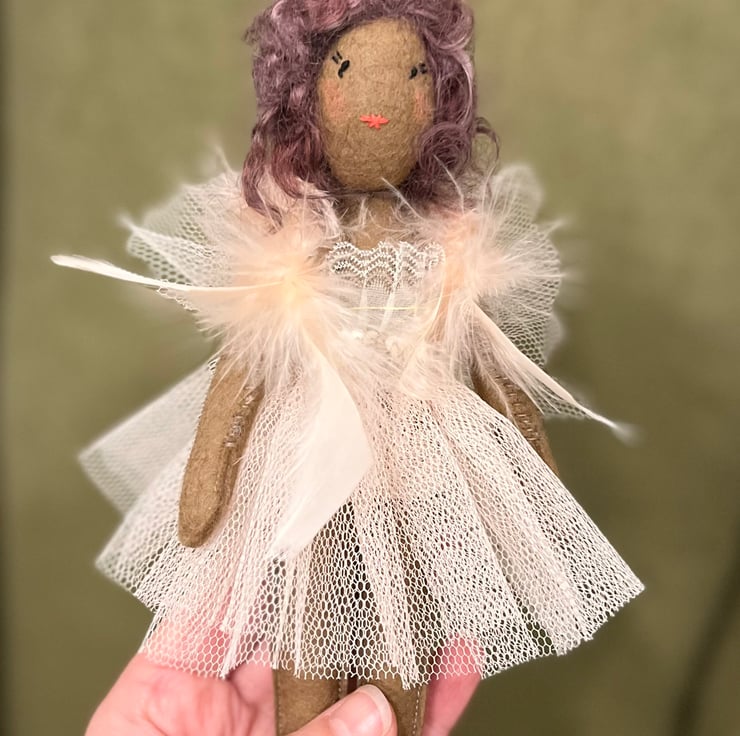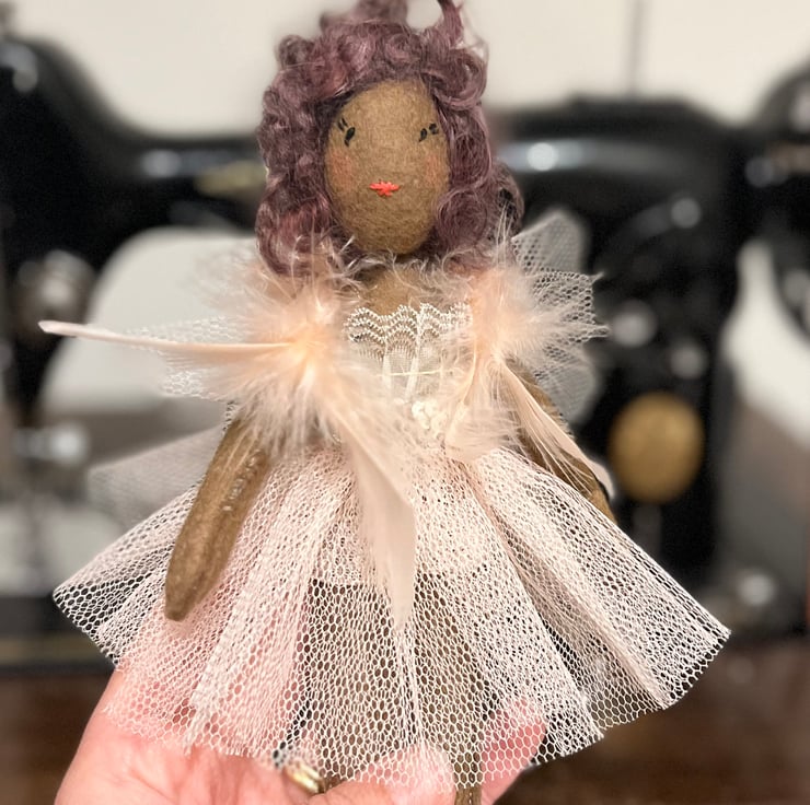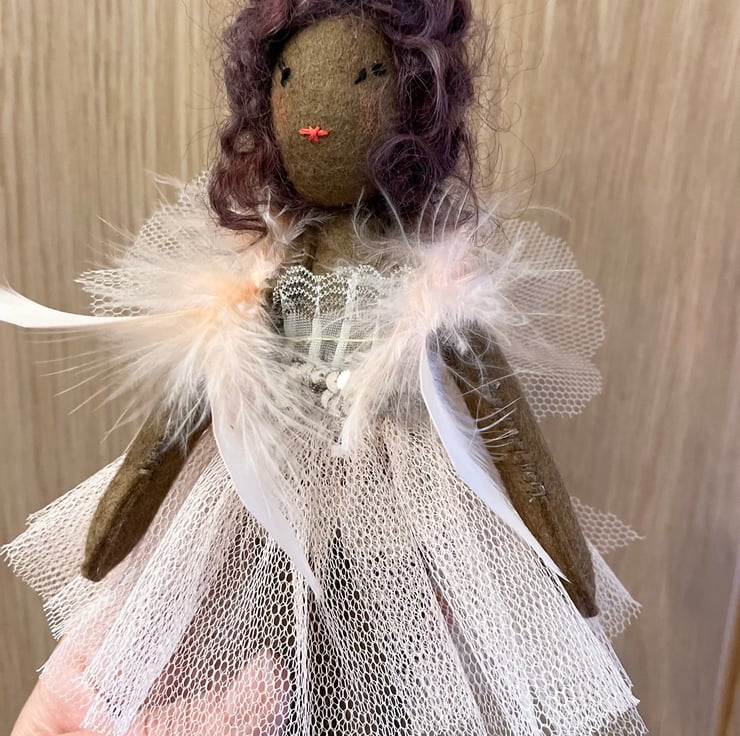 Pretty little one of a kind fairy to top your Christmas tree or offer a little magic all year round. Yulia is a unique Christmas decoration made from wool felt, tulle and lace and feathers.