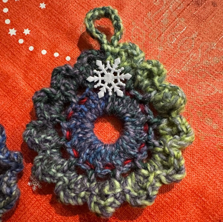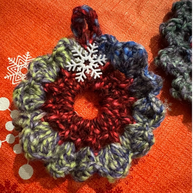 This set of two mini crochet Christmas wreaths with snowflake detail is handmade by me using a festive mix of green, red and soft grey-blue shades.