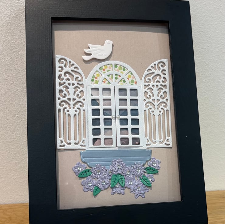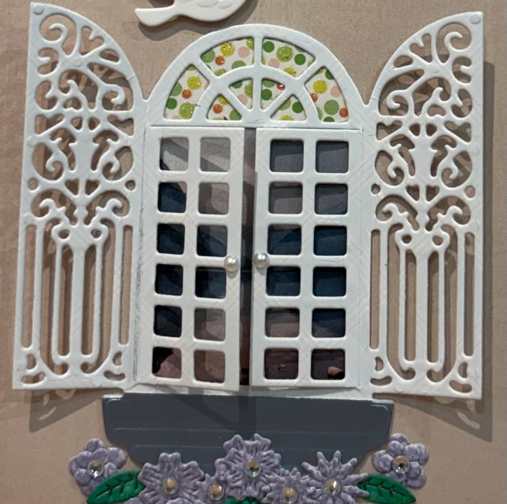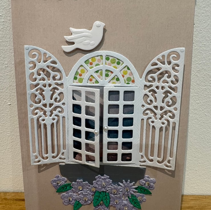 This is a die cut picture consisting of a decorative shuttered window with delicate flowers and a white dove.