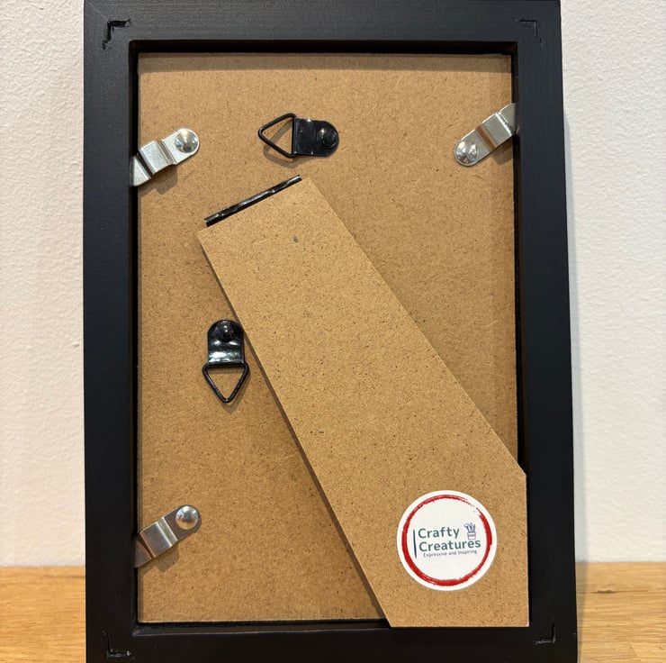 Presented in a wooden black frame with acrylic glass, measuring 6x4 inches. It is ready for hanging on a wall or tabletop placement.