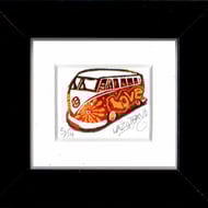 After being carefully hand carved using professional linoleum cutting tools, traditional oil based relief ink is then spread over the linoleum with a Japanese soft rubber brayer (roller). Japanese Awagami Washi Hosho Select paper, which is made from sustainable materials, is then placed on top of the linoleum before pressure is applied using a press to evenly distribute the ink.